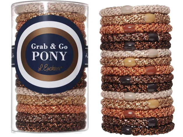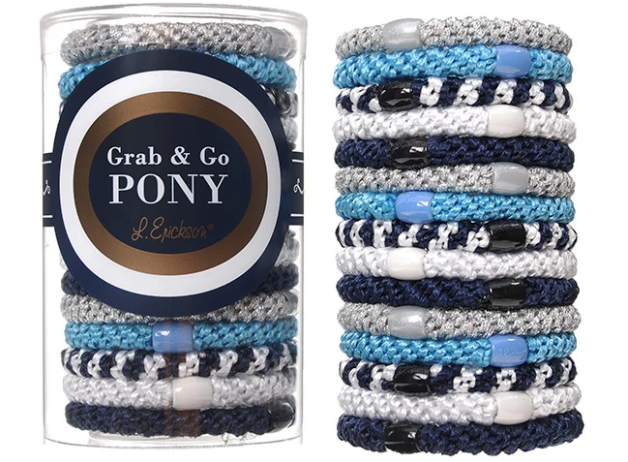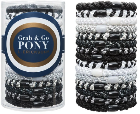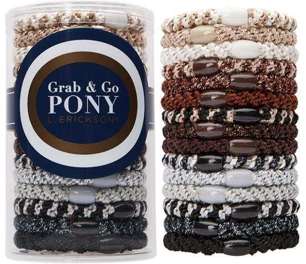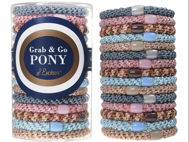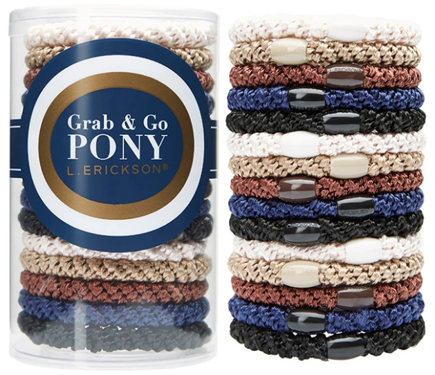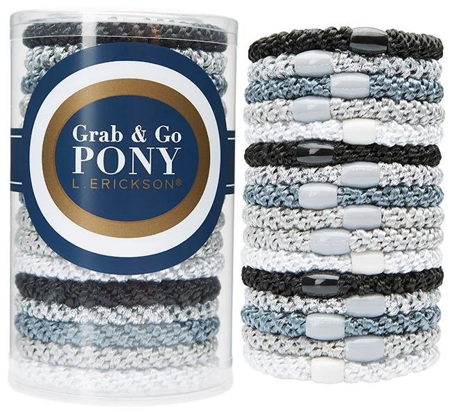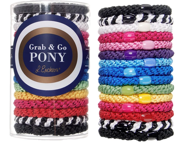 L. Erickson Grab & Go Ponytail Holders are a must-have basic accessory. Set of 15 Ponytail holders, constructed of thick elastic accented with an ornamental oval bead, these ponytail holders are non-damaging. These hair ties are perfect for a simple ponytail and offer exceptional hold. Keep a few in your purse, desk, and car for a quick and comfortable on-the-go styling solution.