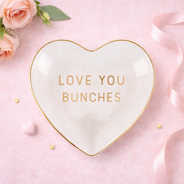 This Heart Shaped Trinket Dish is the perfect gift to show how much you care. Features a beautiful classic and understated black and white design with the words "Love You Bunches". Place it on the dresser, vanity, or nightstand to keep treasured rings and small jewelry items safe. Beautiful Birthday, Mother's Day, or gift for any occasion.