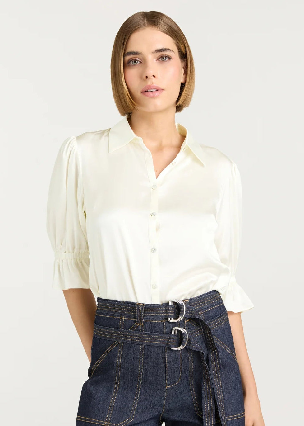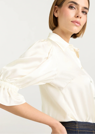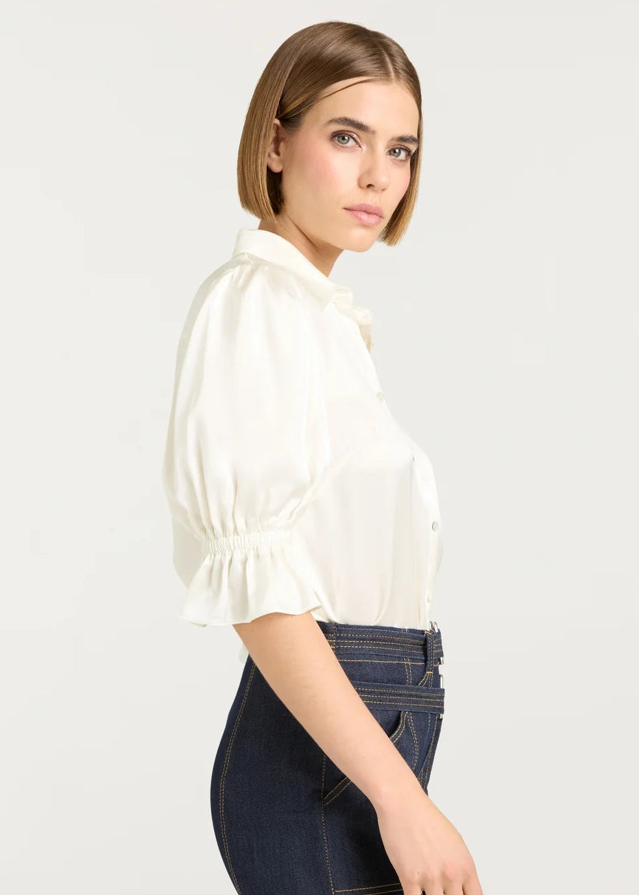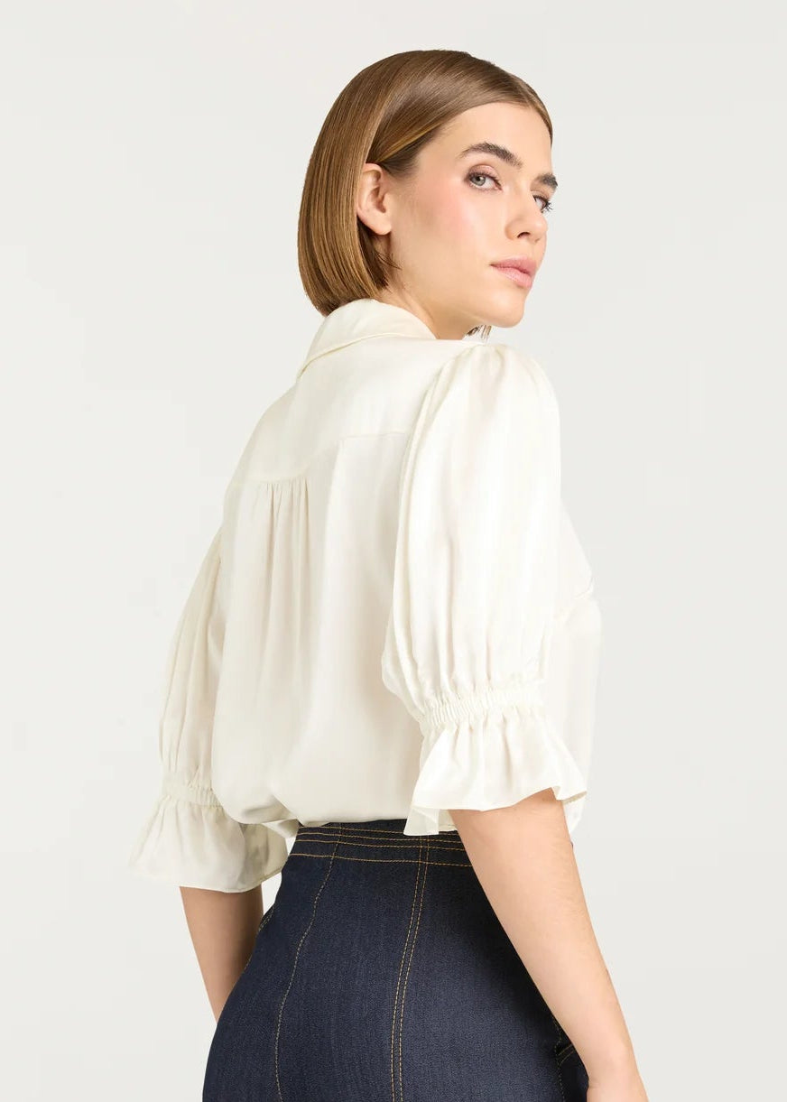 Experience luxury with the Fiona Top. Made from high-quality silk, this blouse features a collared neckline and a trumpet sleeve design for a touch of elegance. The button front adds convenience, and the Ivory color adds sophistication and versatility. Dress up any outfit with this versatile and chic top.