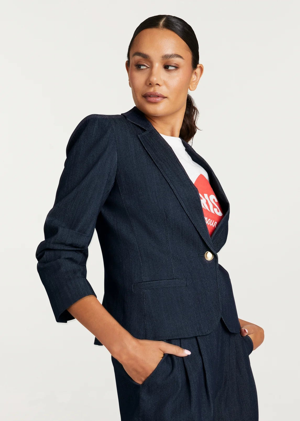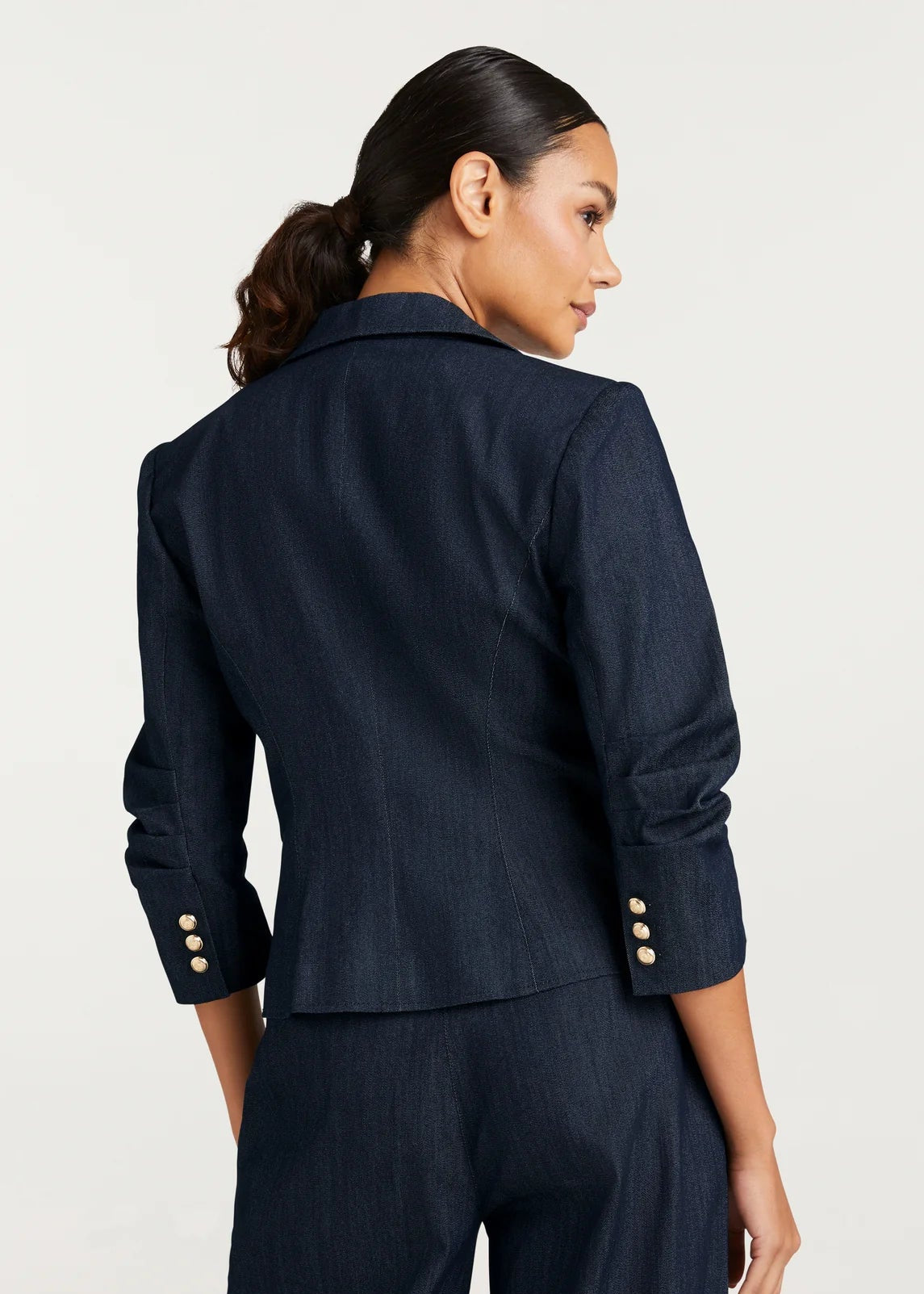 This classic blazer features a flattering one-button closure, crafted from durable indigo denim. Its faux front pockets and three-quarter sleeves add a touch of style, while the back vent ensures comfortable wear. Elevate your look with this versatile and timeless piece.