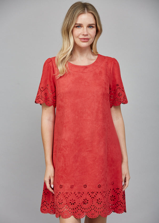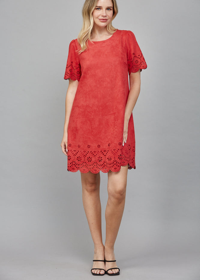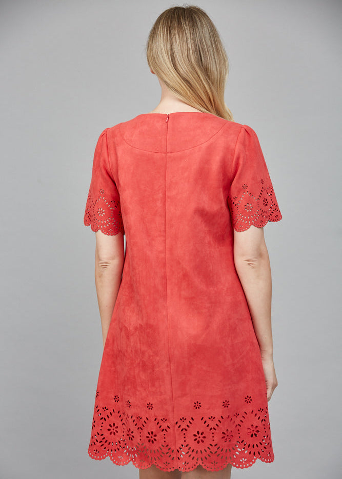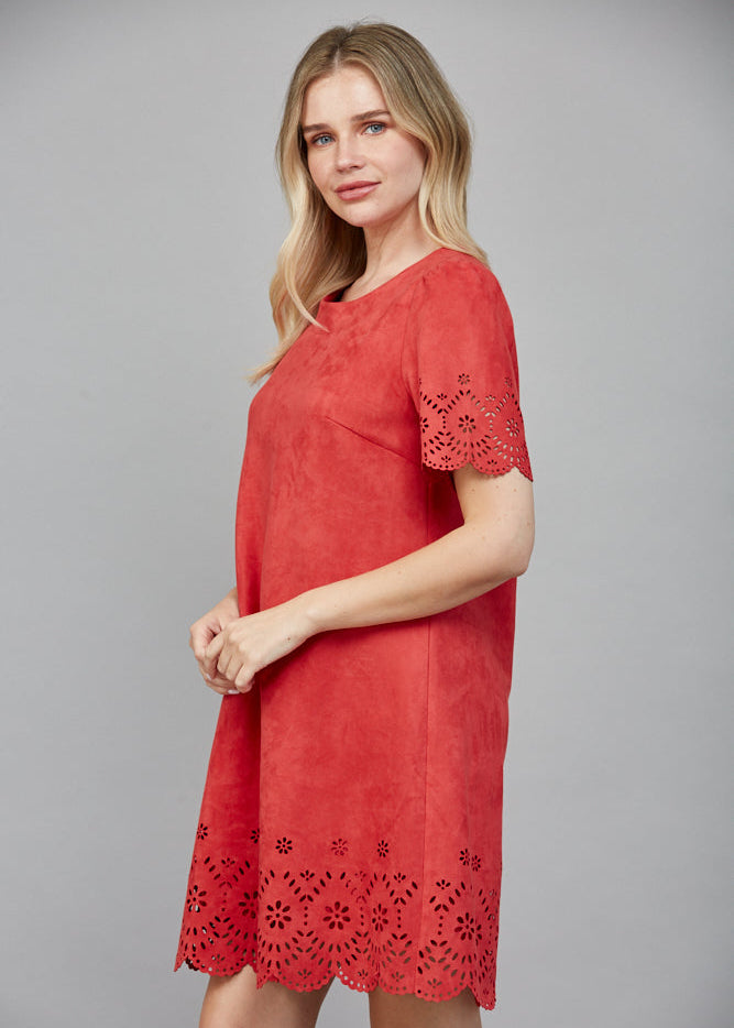 FLORAL LASER-CUT EYELET DETAIL FAUX SUEDE A-LINE DRESS