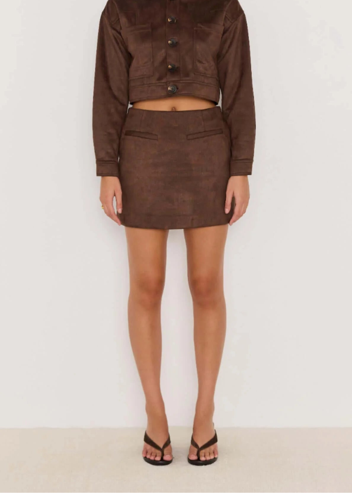The Aston Suede Mini Skirt is a sleek staple with a luxe texture. Cut from soft faux suede, it features a high-rise fit, clean waistband and welt pocket details.