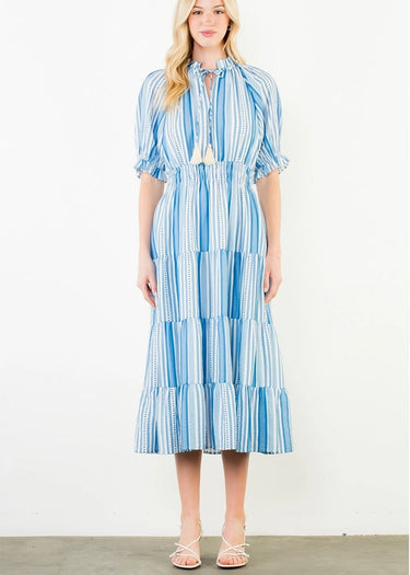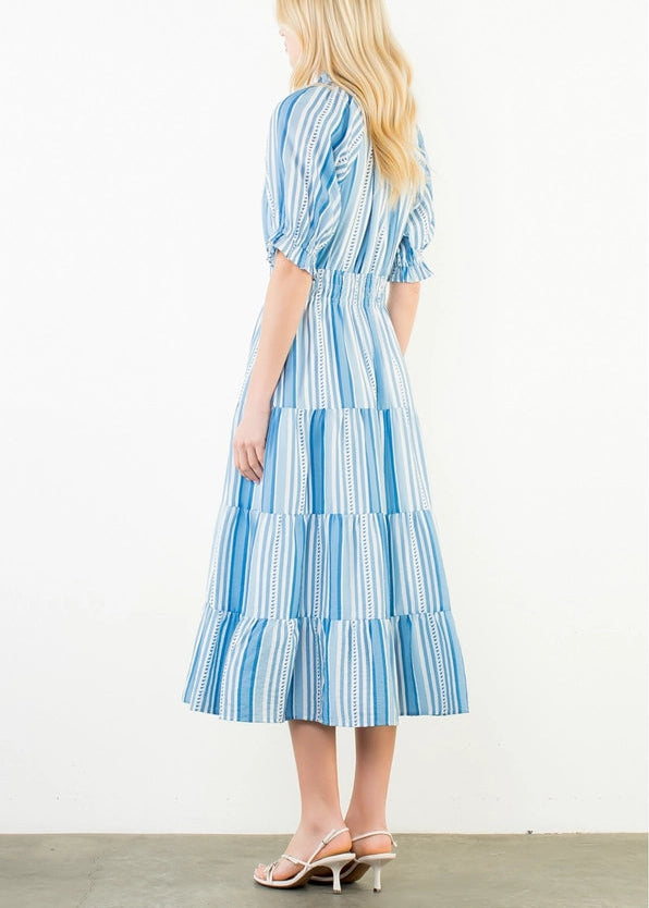 Puff Sleeve Striped Pattern Midi Dress.