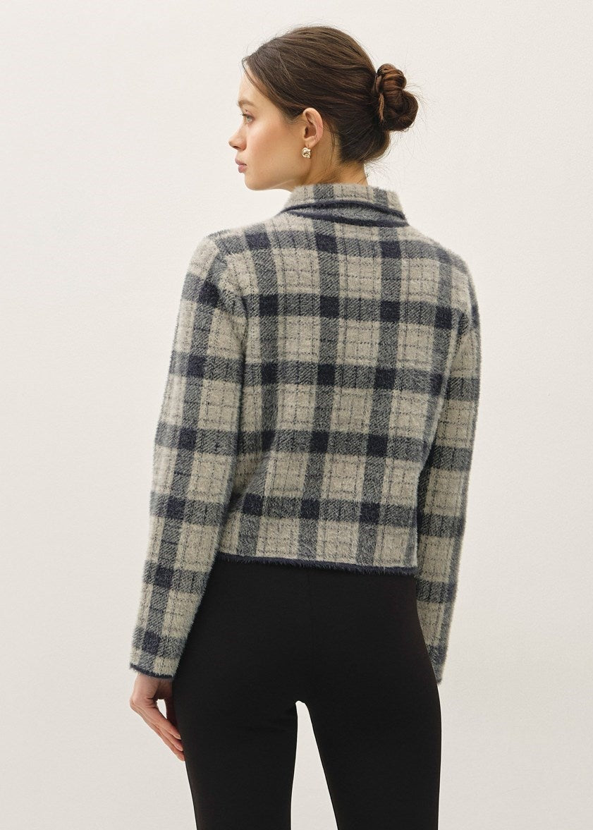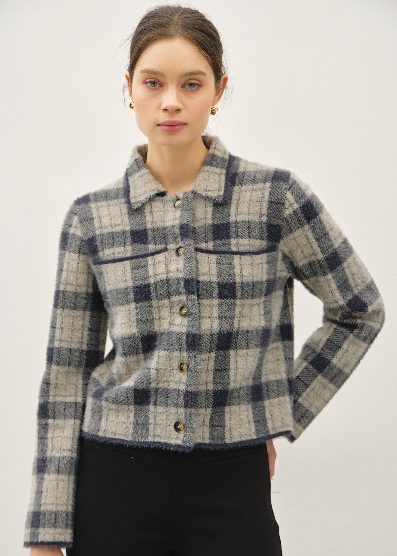 FUZZY PLAID COLLARED CROP CARDIGAN