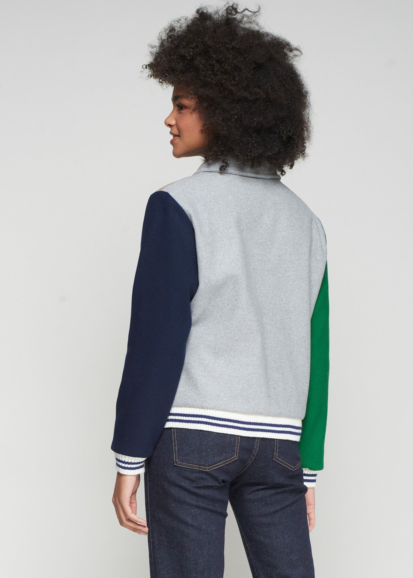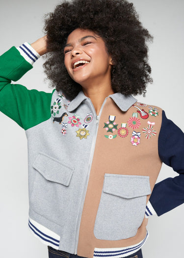 Bomber jacket in multicolor wool-blend fabric: grey, camel, navy and green. The front features embroidered commemorative motifs and decorative emblems. Classic collar, zip-up front, flap pockets, and striped ribbed hem and cuffs. Structured and warm for the season.