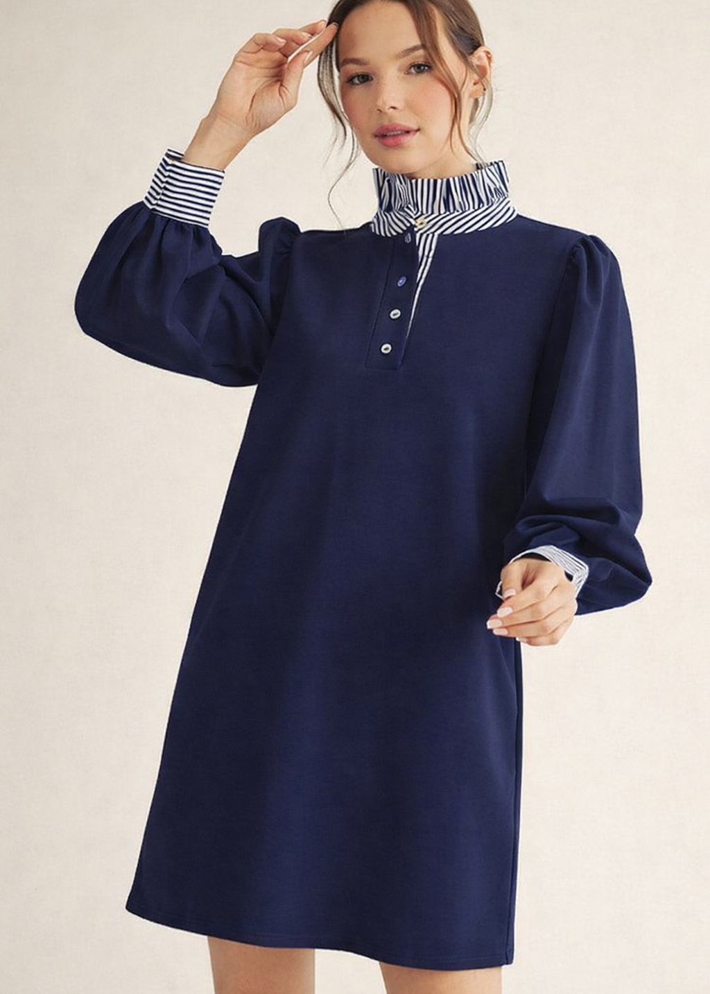 Long puff sleeves solid shift dress with side pockets, front button up, ruffled neckline, stripe contrast accent.