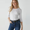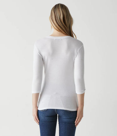 Michael Stars signature ultra-soft cotton Shine fabrication, this fitted crew neck tee has a bit of sparkle and subtle sheen. It features a banded neckline and 3/4 sleeves for a polished, clean fit that hugs your body in all the right places.