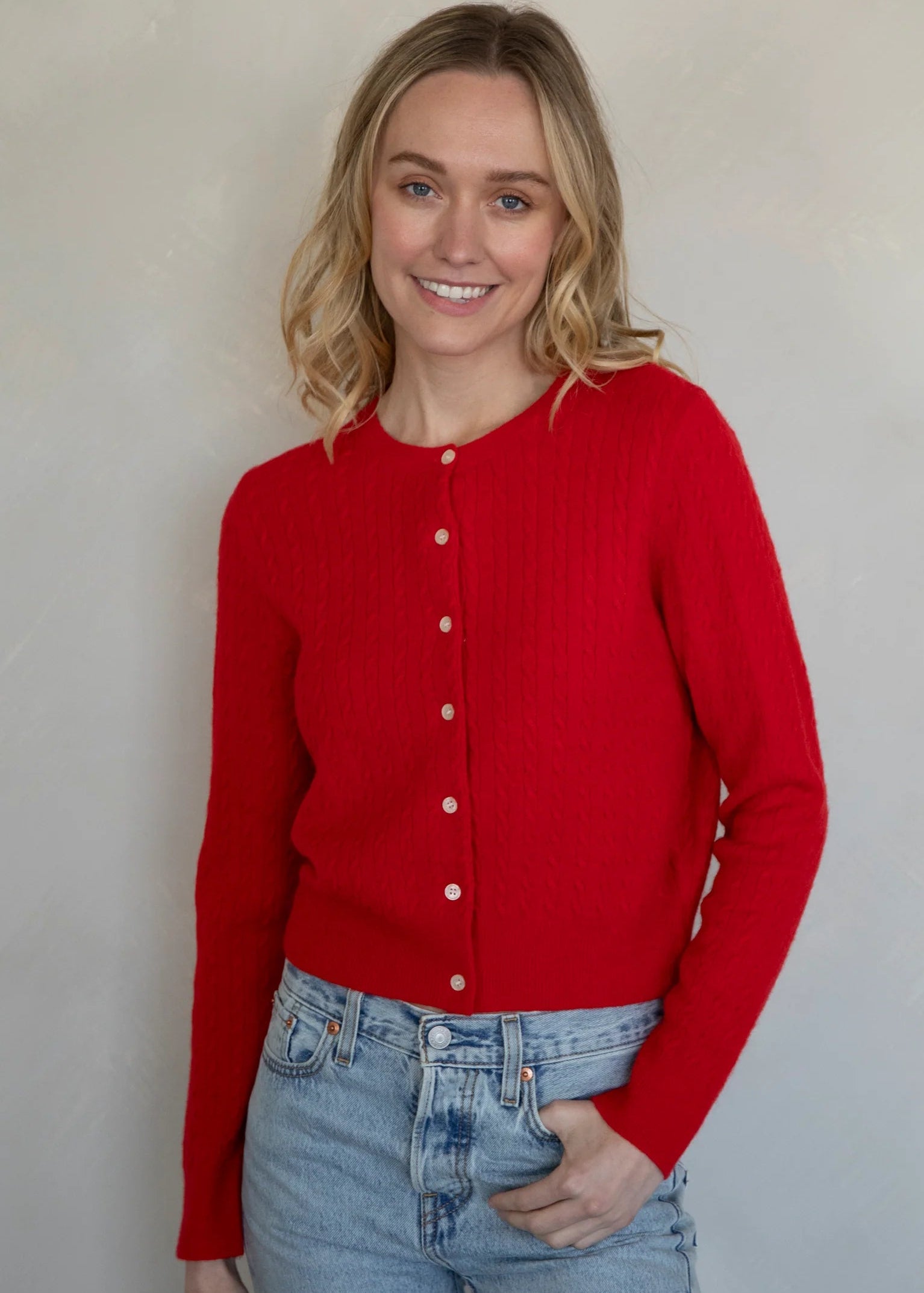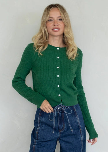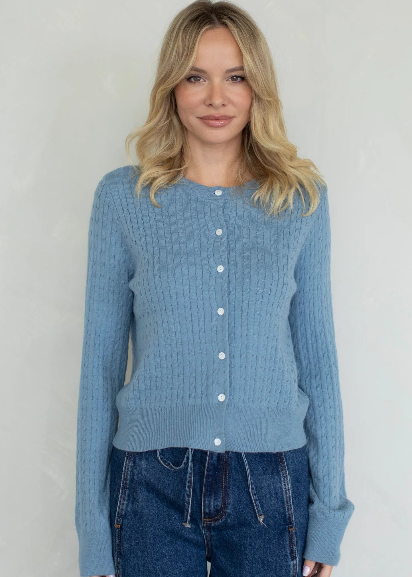 Cable knit button-down cardigan.