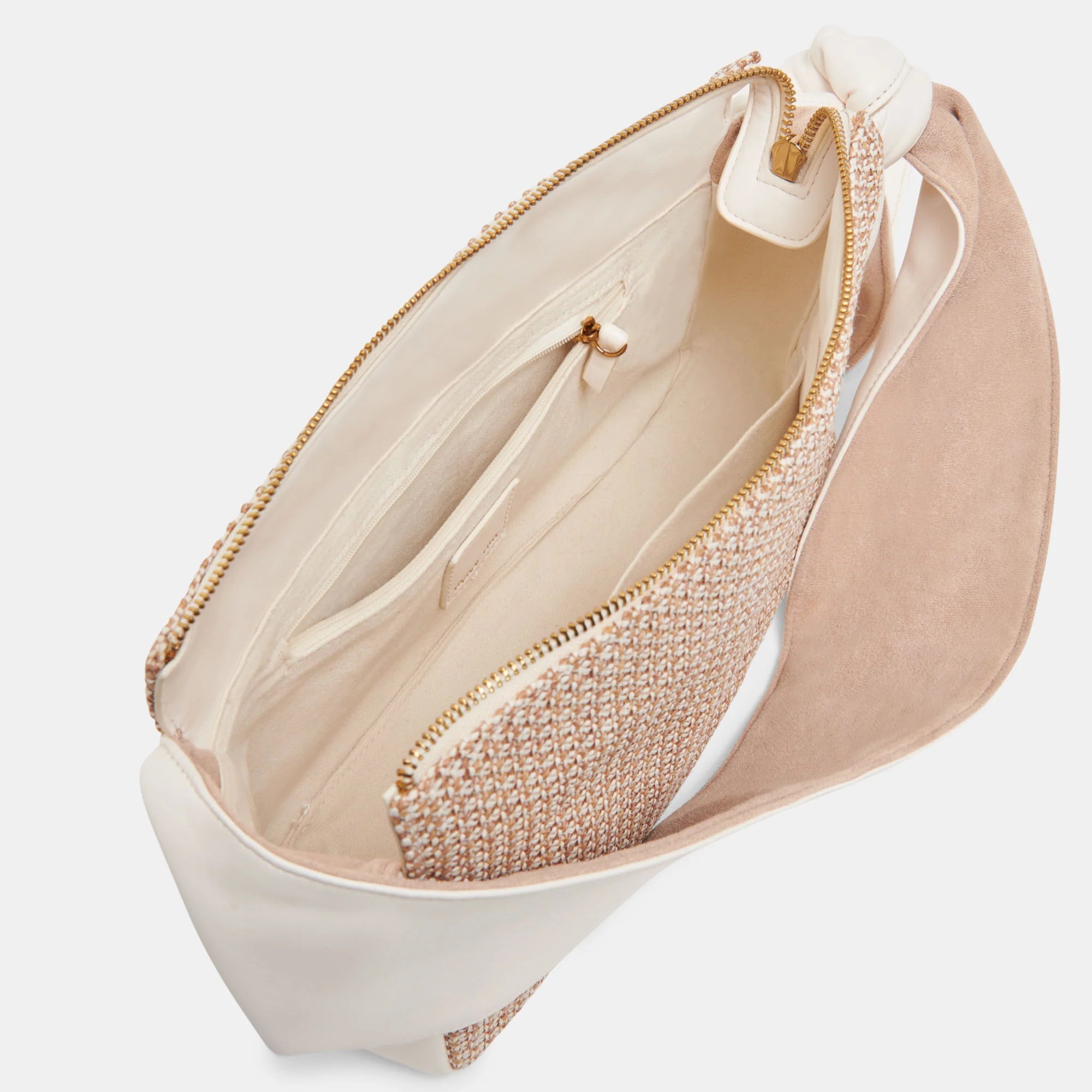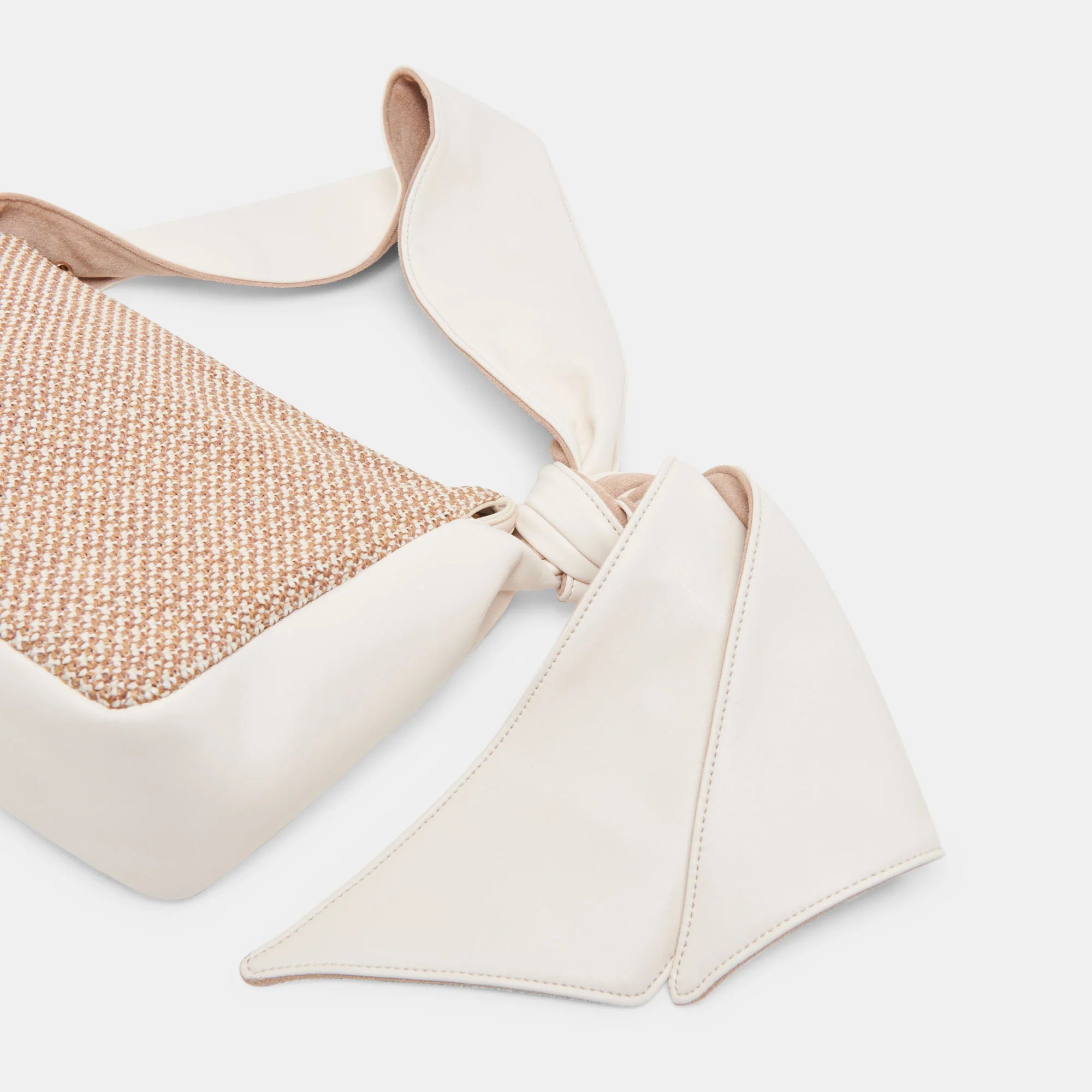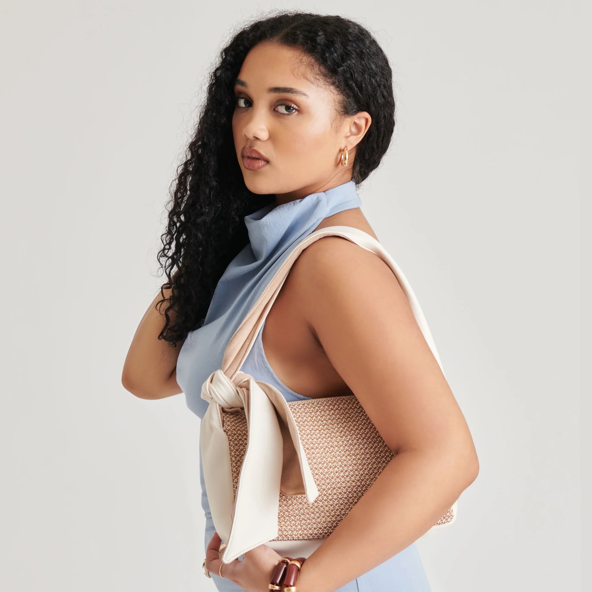 The timeless neutral shoulder bag your wardrobe needs. LUCIE’s ivory meets raffia design and scarf-like knotted strap will have you looking effortlessly put together.