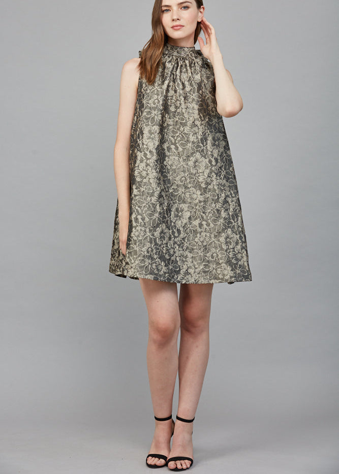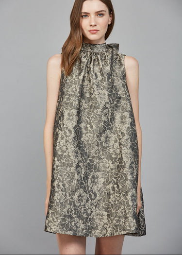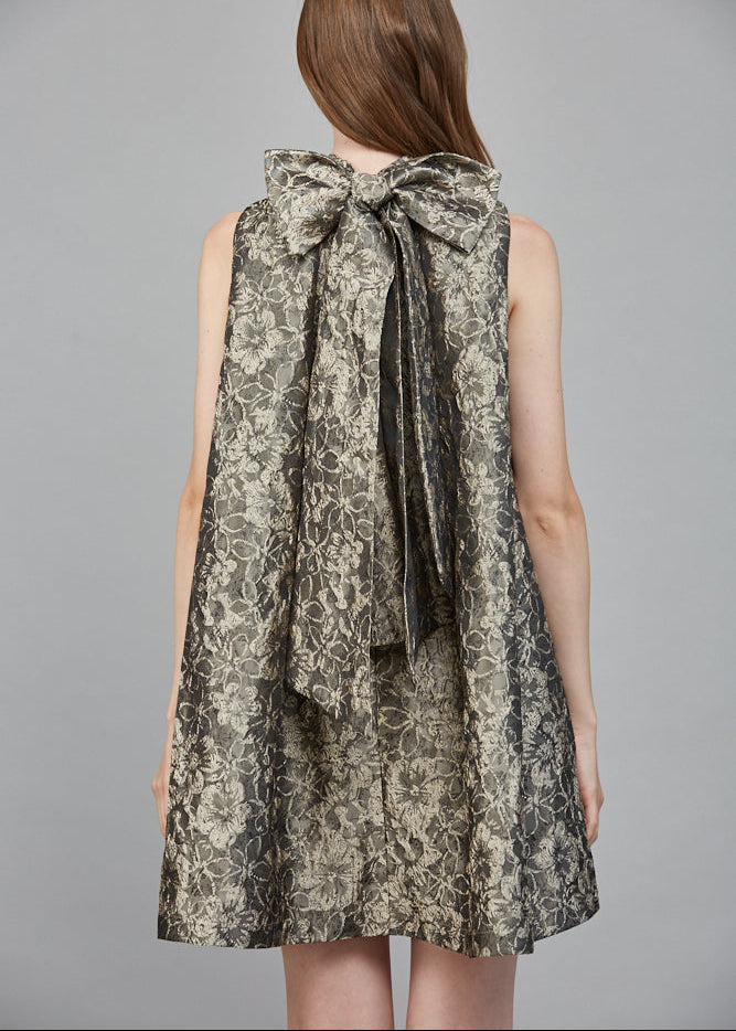 FLORAL PATTERN JACQUARD FABRIC HIGH NECKLINE BOW TIE BACK DETAIL A-LINE DRESS