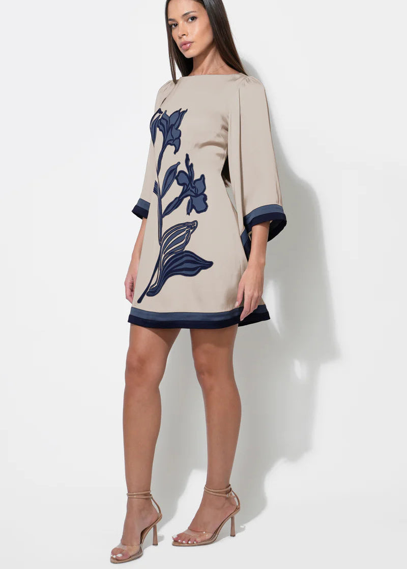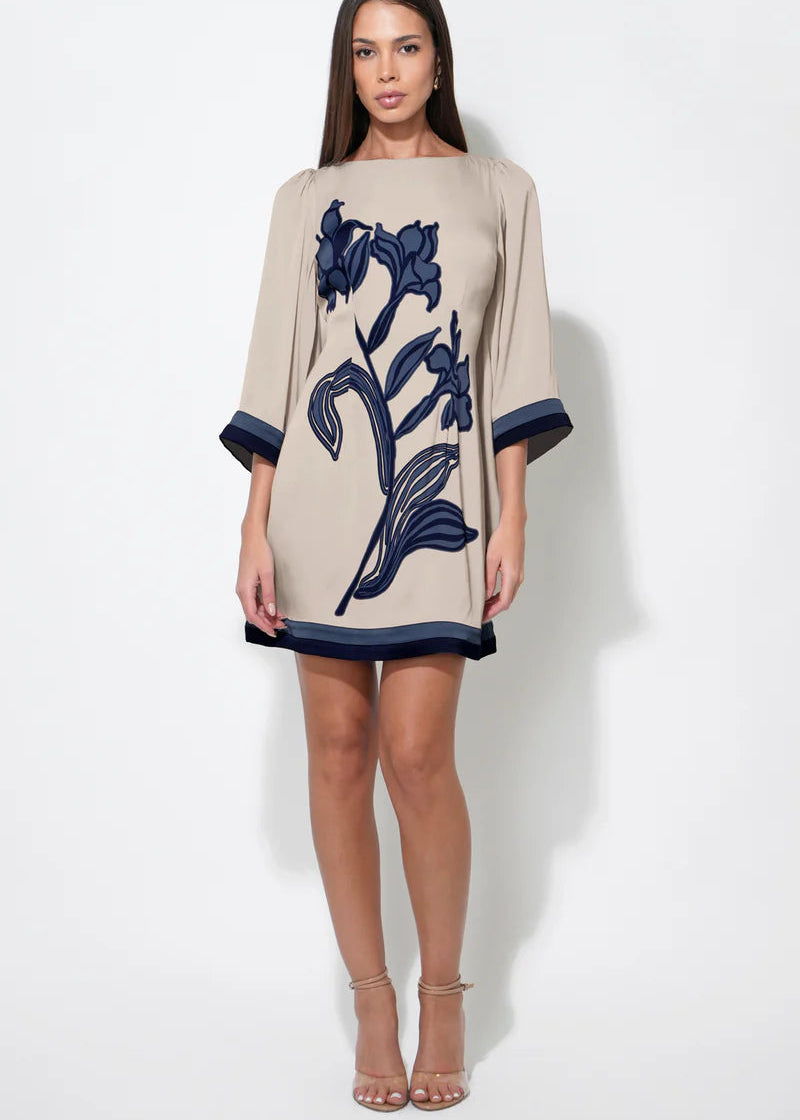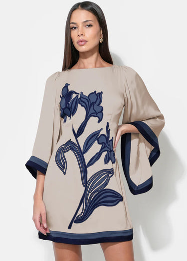 This dress showcases a striking pattern of blown-up flowers set against a contrasting background, utilizing a Beige and Navy color palette for a rich, sophisticated look. The silhouette is a flirty mini dress length, balanced by romantic bell sleeves that add volume and movement. The neckline appears to be a flattering cut, allowing the bold print to take center stage.
