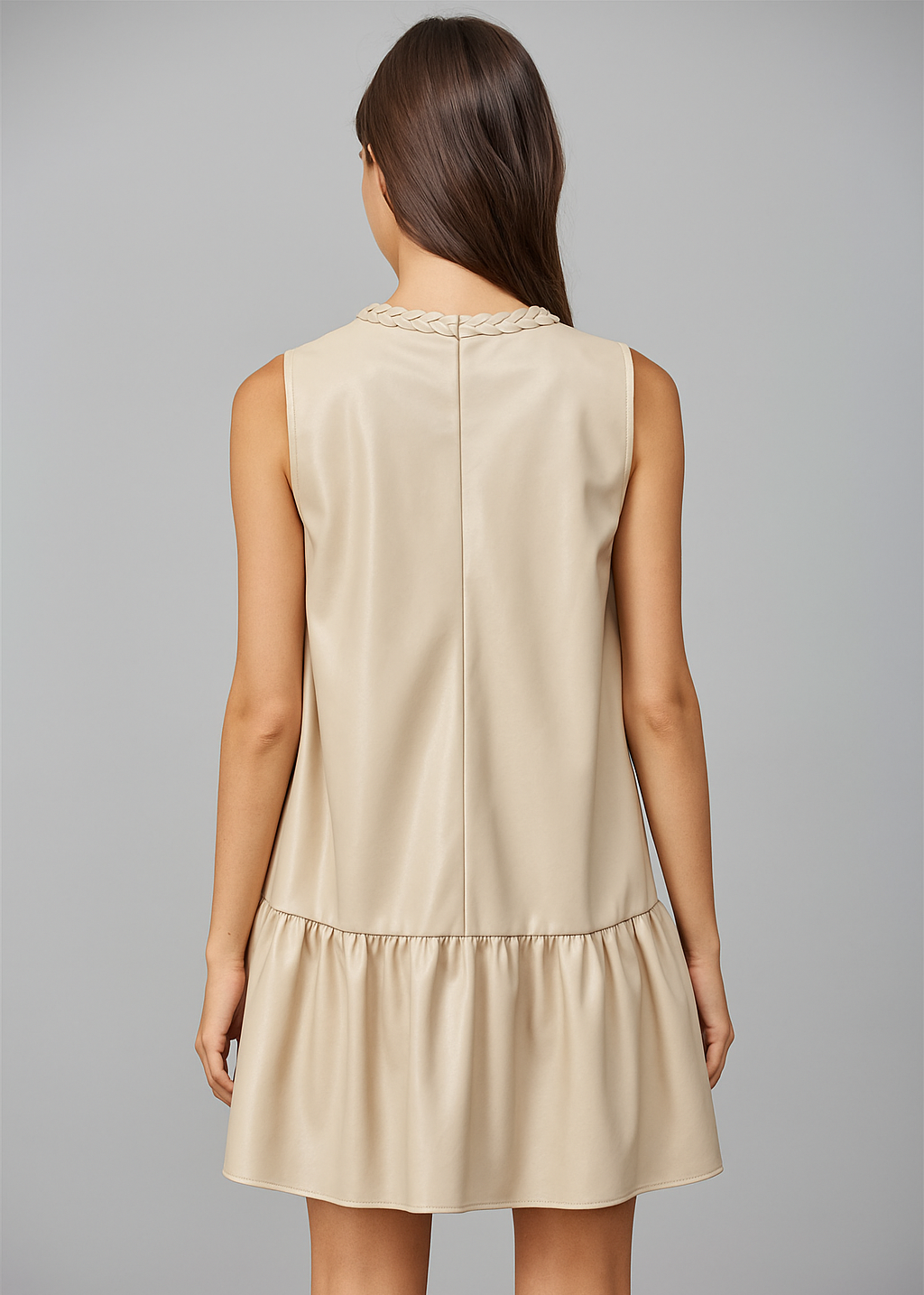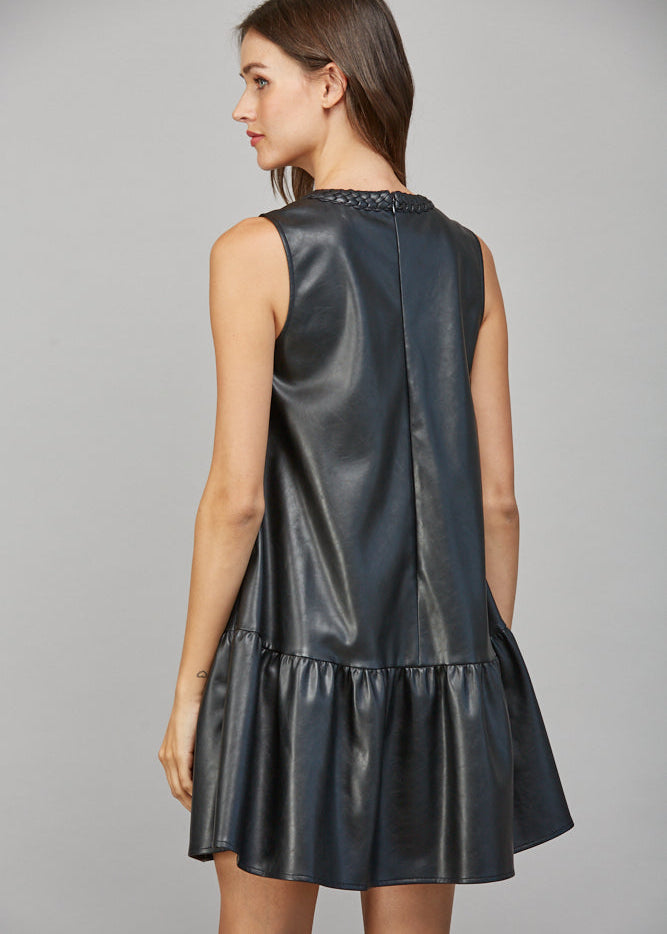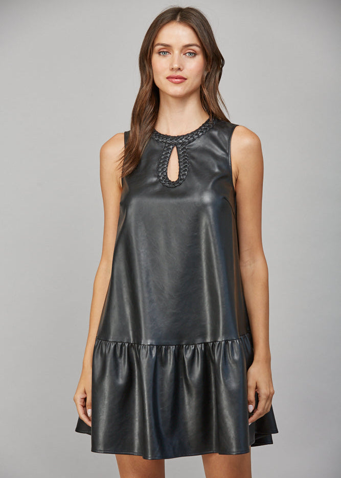 BRAIDED KEYHOLE NECKLINE SLVL FAUX LEATHER DRESS