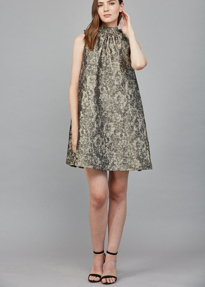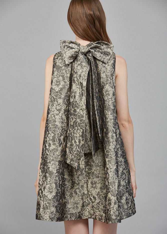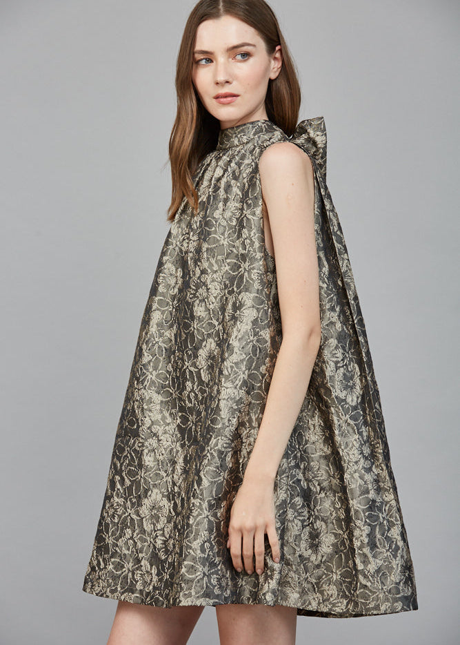FLORAL PATTERN JACQUARD FABRIC HIGH NECKLINE BOW TIE BACK DETAIL A-LINE DRESS
