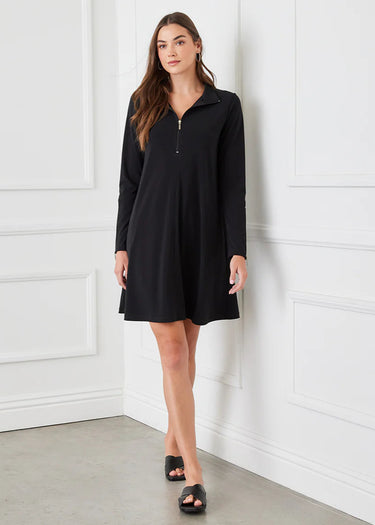 This long sleeve dress is made from lightweight travel jersey with a smooth, stretchy feel that resists wrinkles. It features a half-zip front, a clean folded collar, and convenient side pockets. Zipper accents at the sleeves add a sleek, modern finish—wear them closed or slightly open for an adjustable fit. Designed to hit just above the knee, the relaxed silhouette keeps things comfortable and effortless.