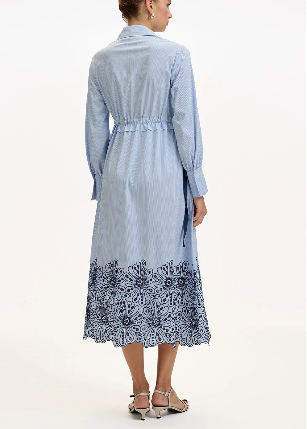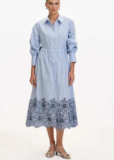 Crisp and feminine, this blue striped shirt dress features a flattering cinched waist, tailored collar, and delicate embroidered hem for a romantic finish. Effortlessly polished yet easy to wear, it’s perfect for sunny days, brunch dates, and everything in between.