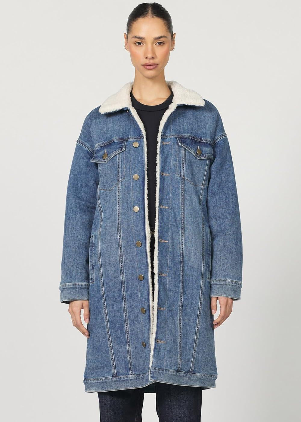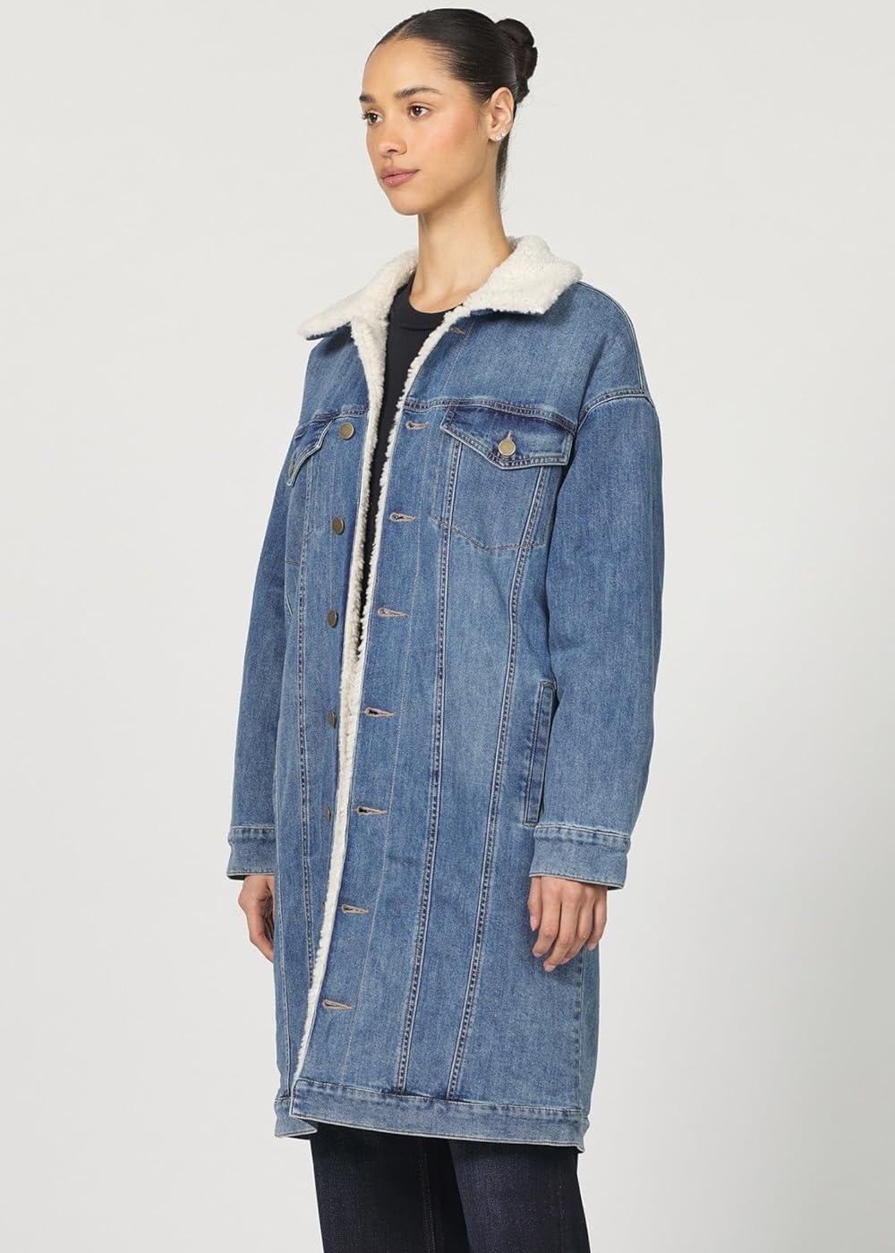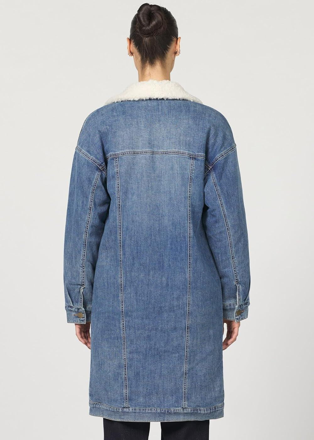 Long Button Front Sherpa Collar Oversized Stretch Denim Coat