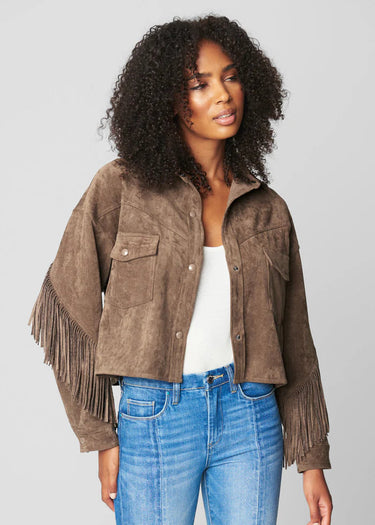 Faux Suede Shirt Jacket with Fringe Detailing Along Back, arm and Sleeve