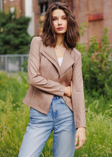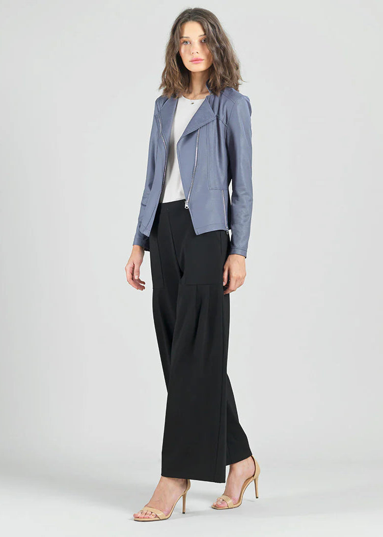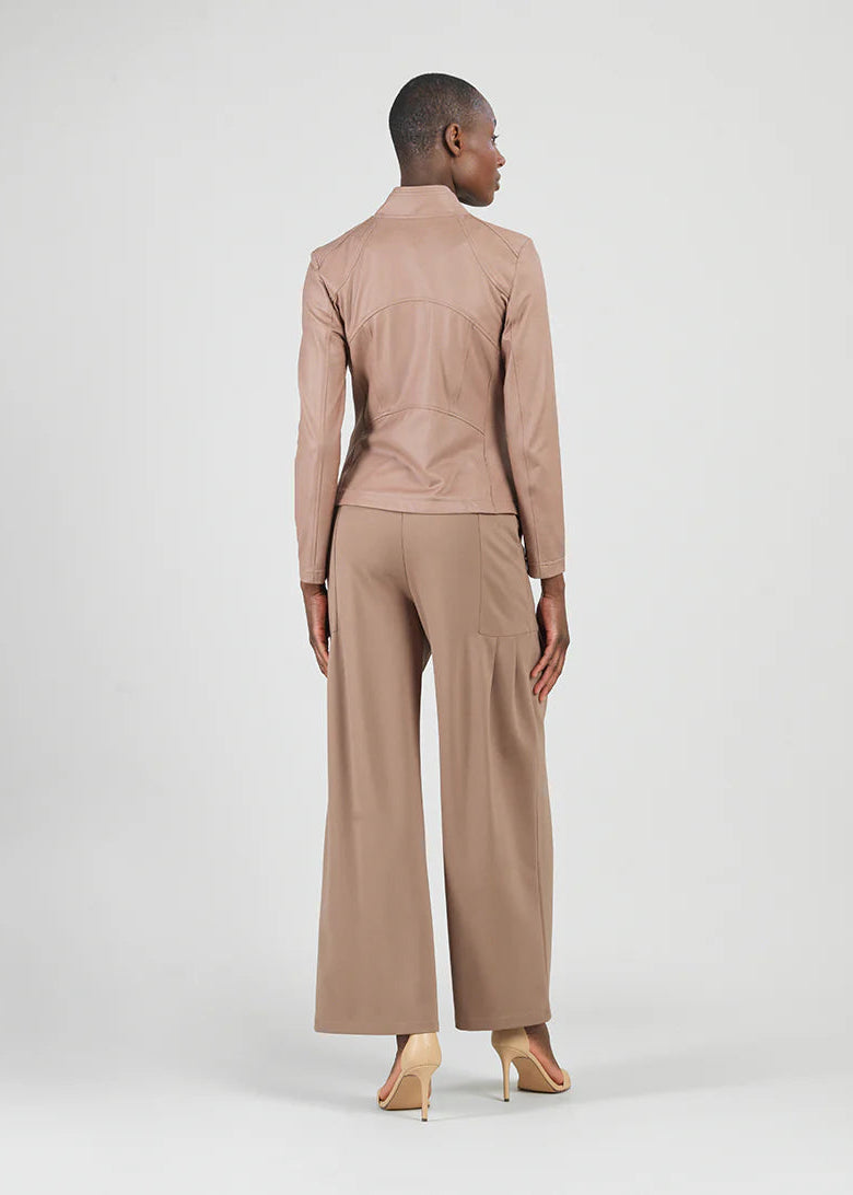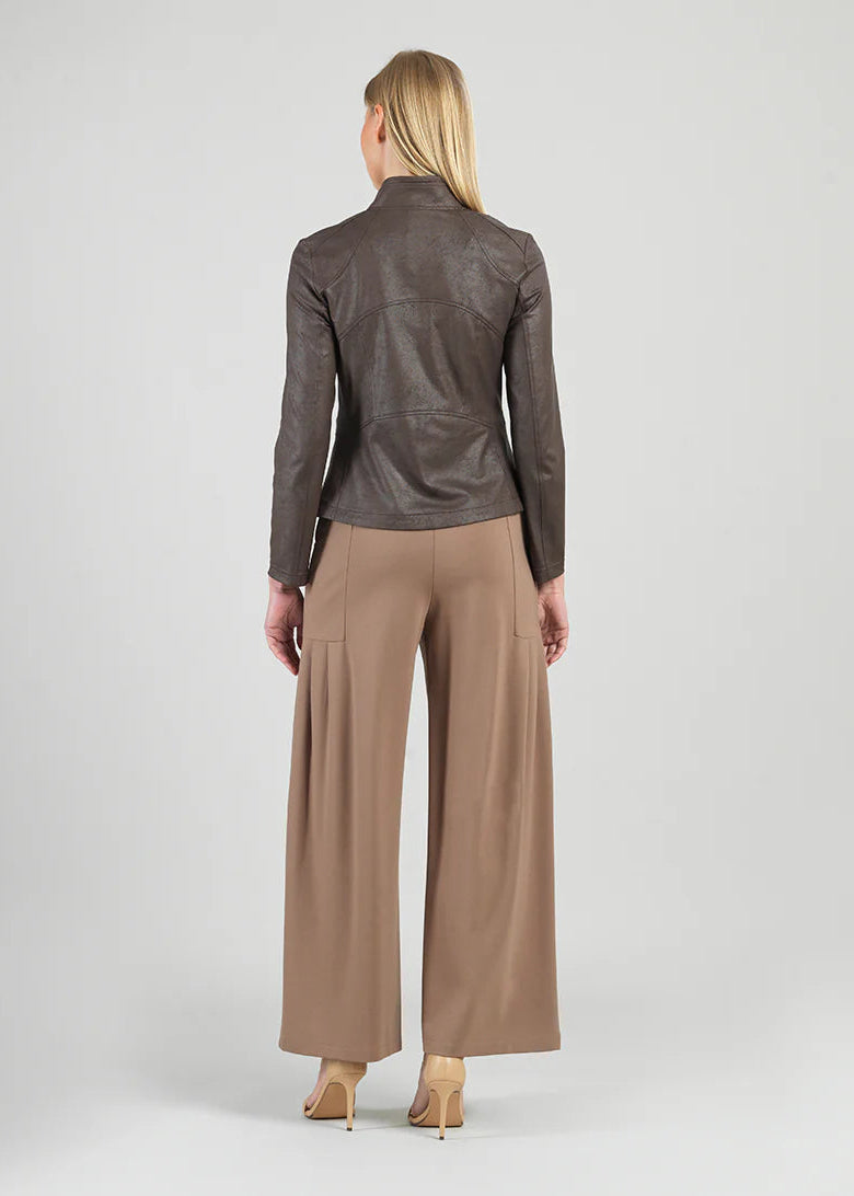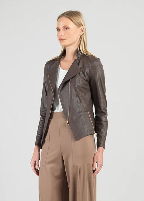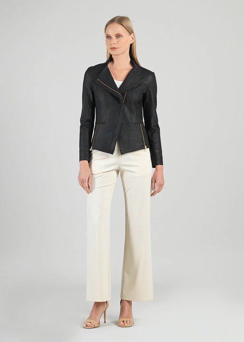 Made from beautiful signature stretch knit, extremely lightweight soft "lambskin feel" fabric with an antique-like matte finish. This jacket features a notched lapel with upright collar, long sleeves, gold asymmetrical zip closure, faux pocket zipper slits, as well as complementary detailed front and back stitching.
