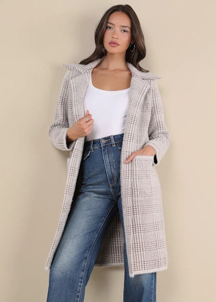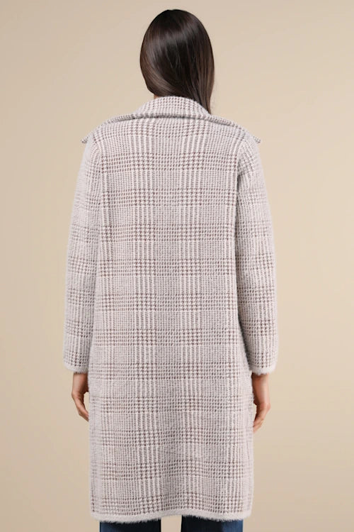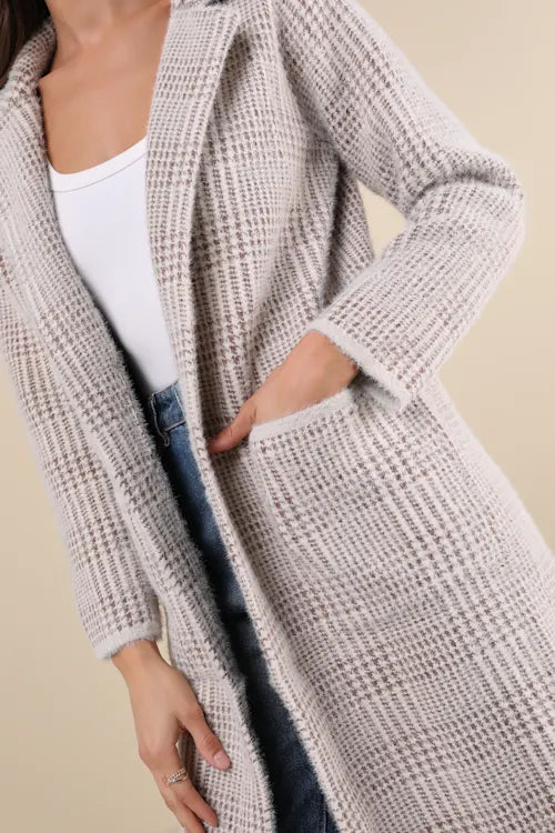 Fuzzy eyelash knit, with a brown houndstooth-style pattern, shapes this effortless coat with a notched collared neckline and long sleeves. The longline silhouette features an open-front design and functional, twin patch pockets that keep your hands toasty warm on those chilly days!