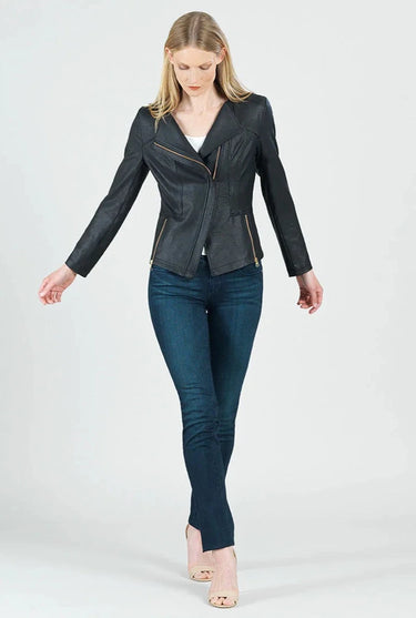 Made from beautiful stretch knit, extremely lightweight soft "lambskin feel" fabric with a soft matte finish. This jacket features a notched lapel with upright collar, long sleeves, silver a-symmetrical zip closure, faux pocket zipper slits as well as complimentary detailed front and back stitching.