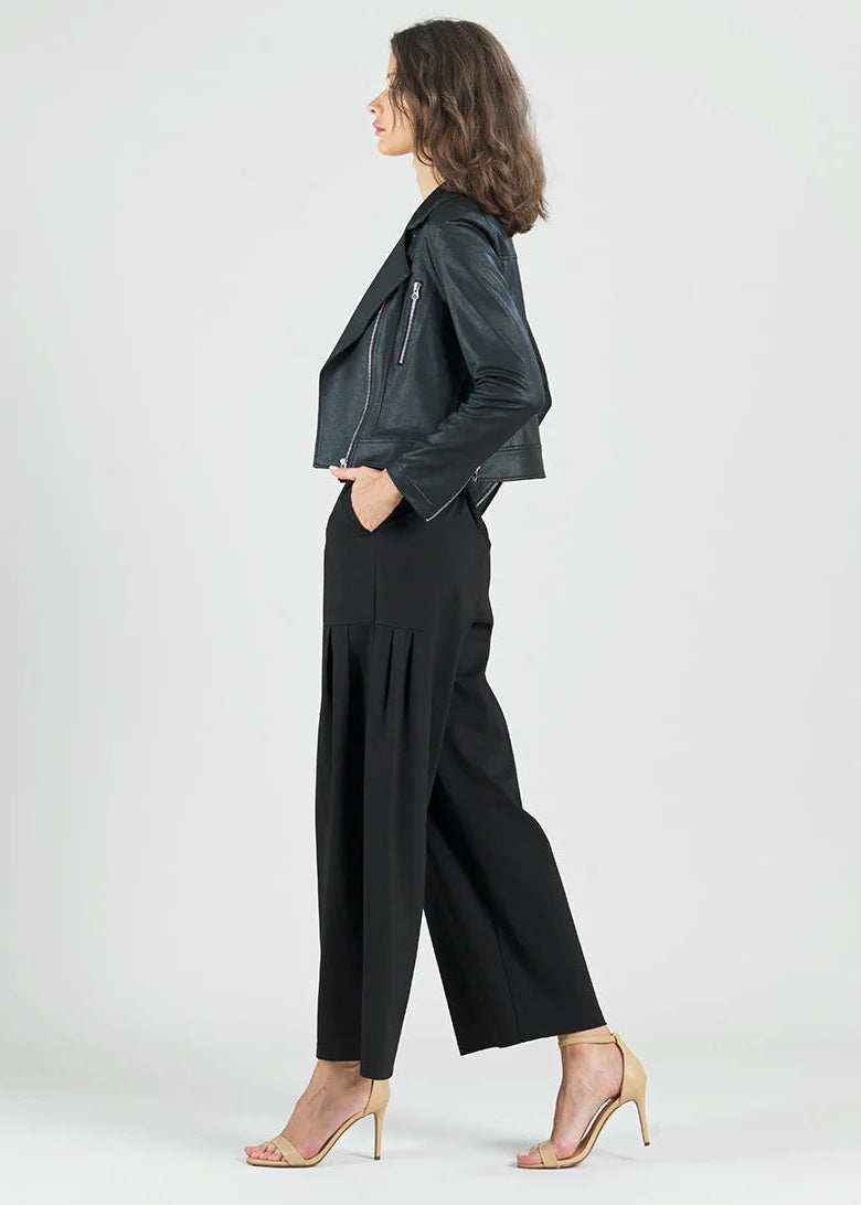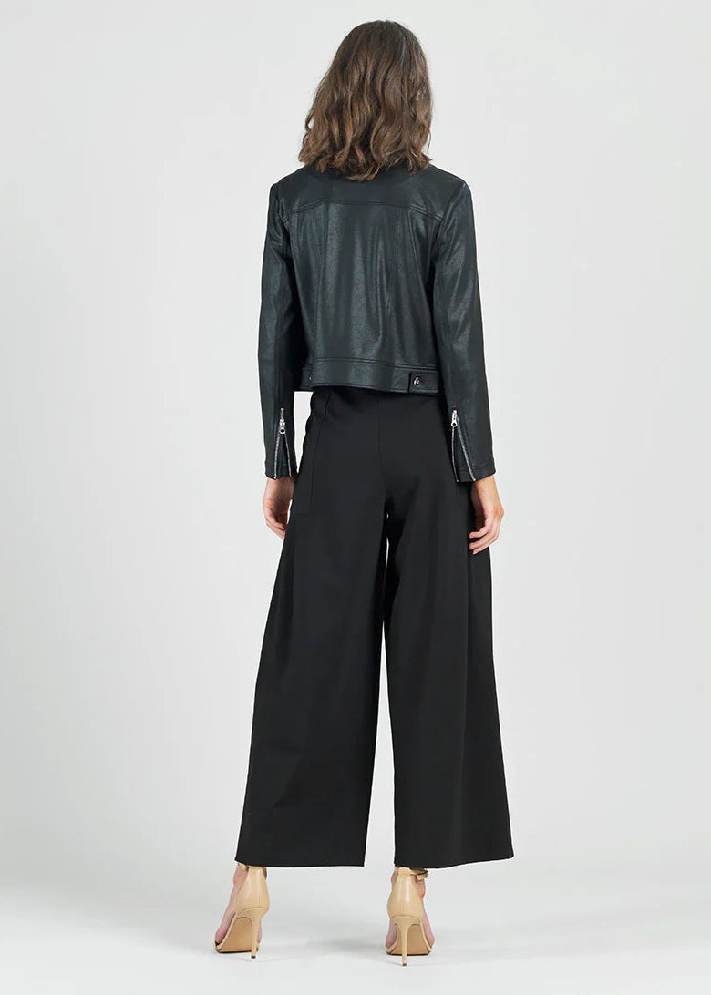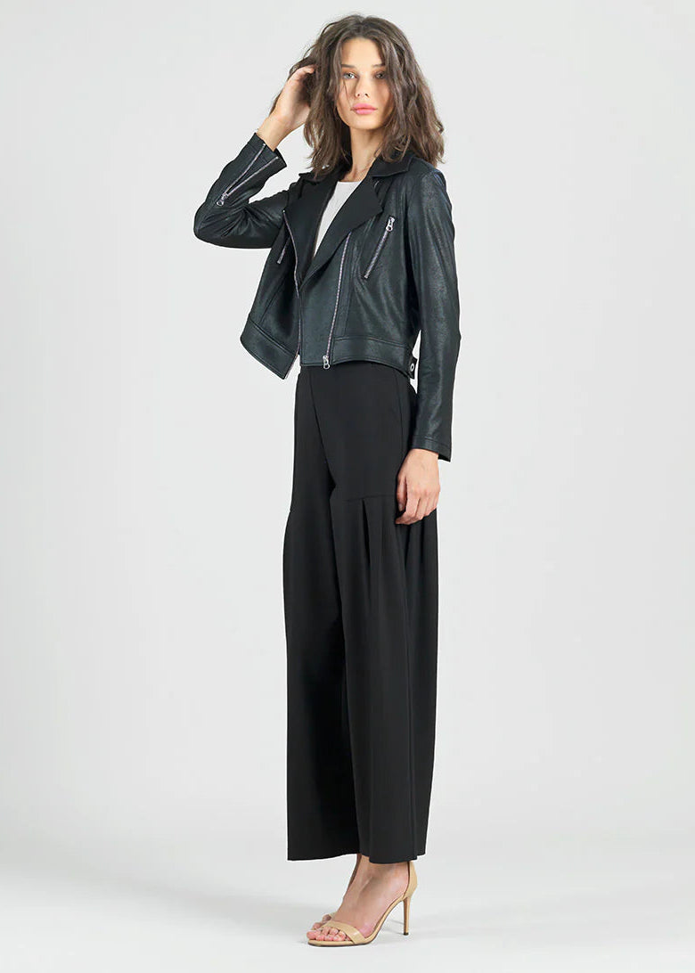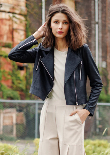A feminine take on men's motorcycle jackets. Coated with extremely lightweight, vegan-friendly leather and an interior that is made from soft knit giving it the right amount of stretch with breathable superb wear that conforms to your body and provides you with the utmost comfort