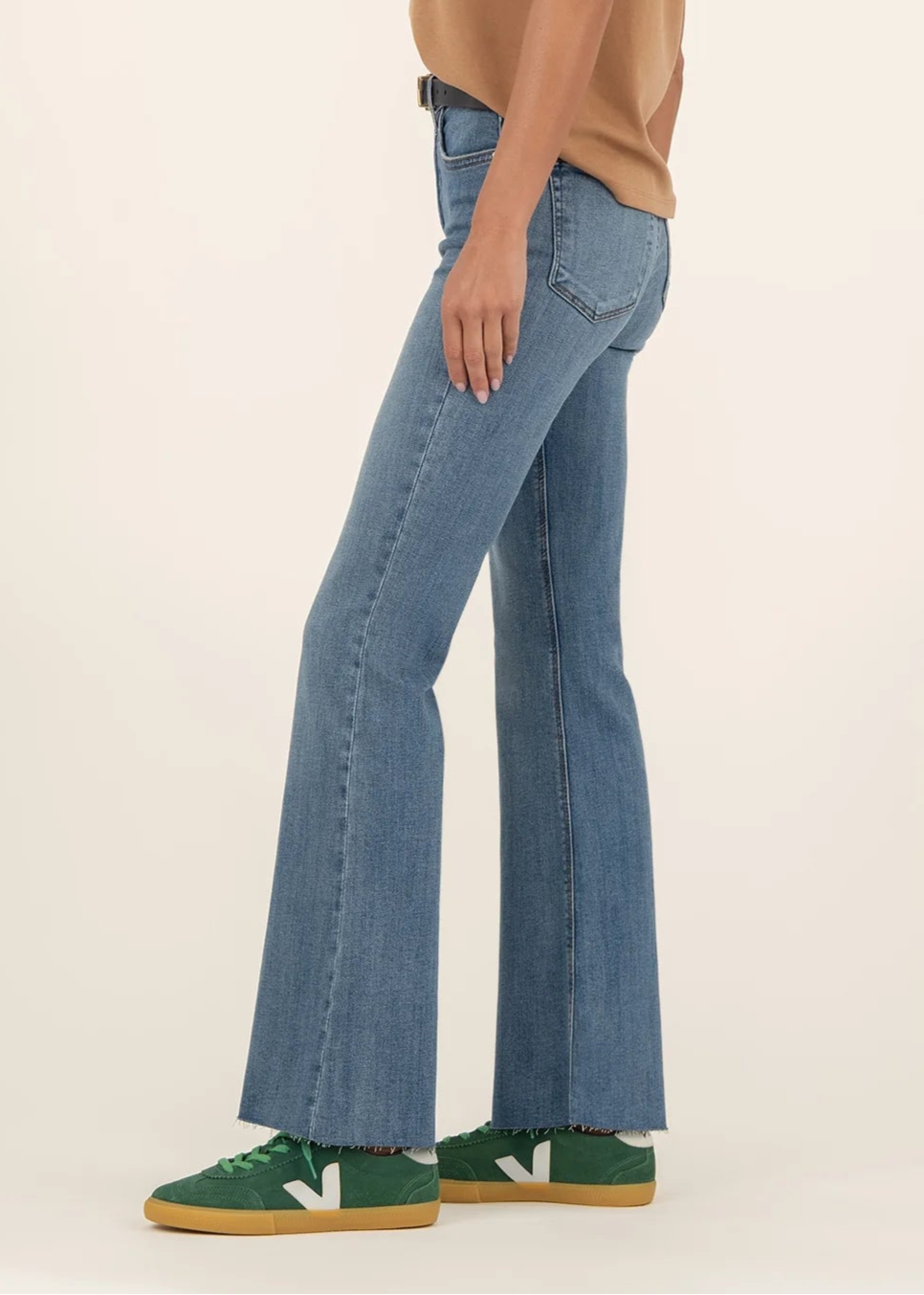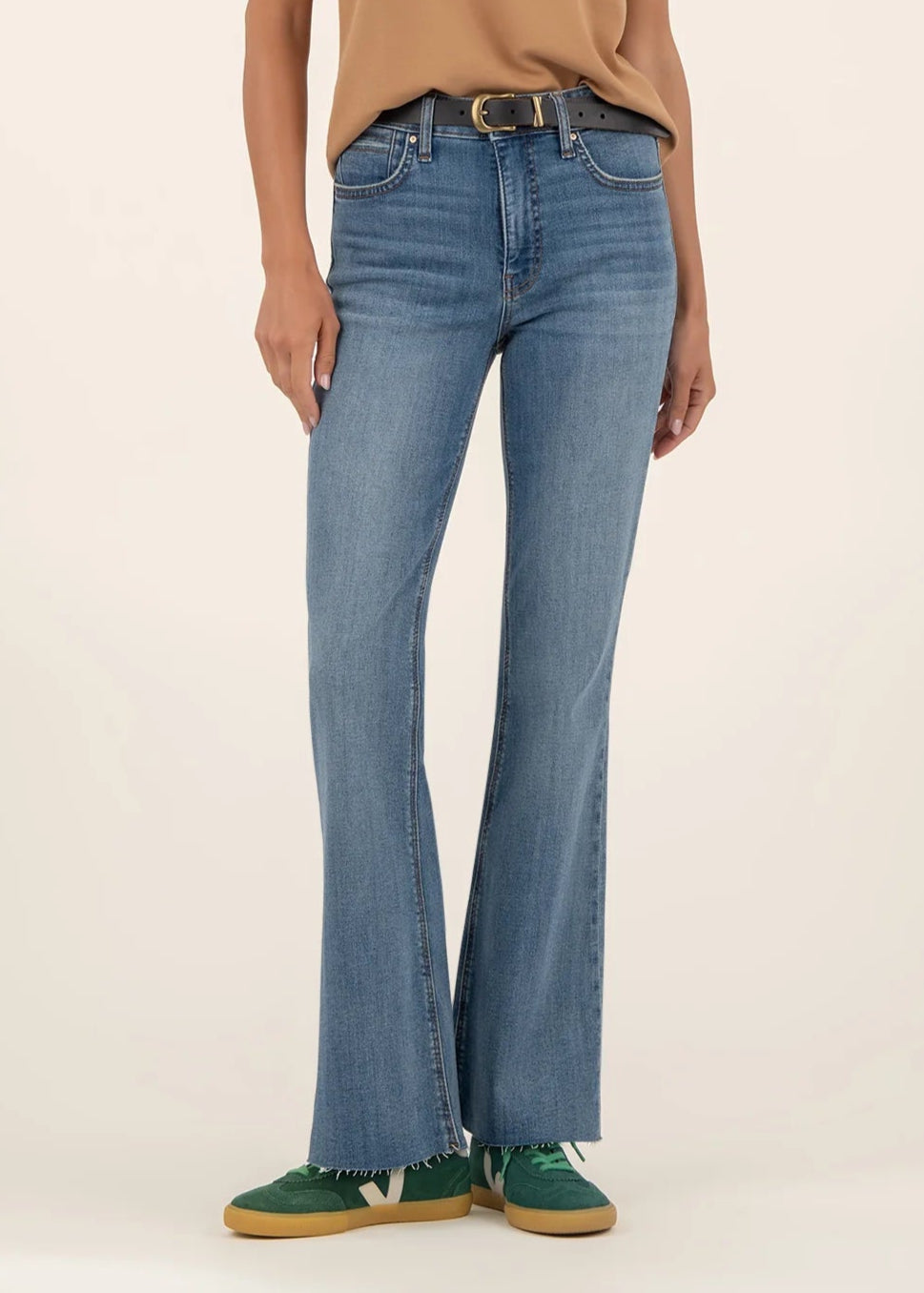 Turn heads in these high-rise flare jeans, rocking a vintage-inspired medium wash with Fab Ab for that flawless fit. The raw hem adds a rebellious touch, while super stretchy fabric keeps you moving with ease