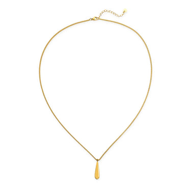 This elegant curb chain necklace features a beautifully crafted teardrop pendant. The polished gold finish enhances its luxurious appearance, making it a versatile accessory.