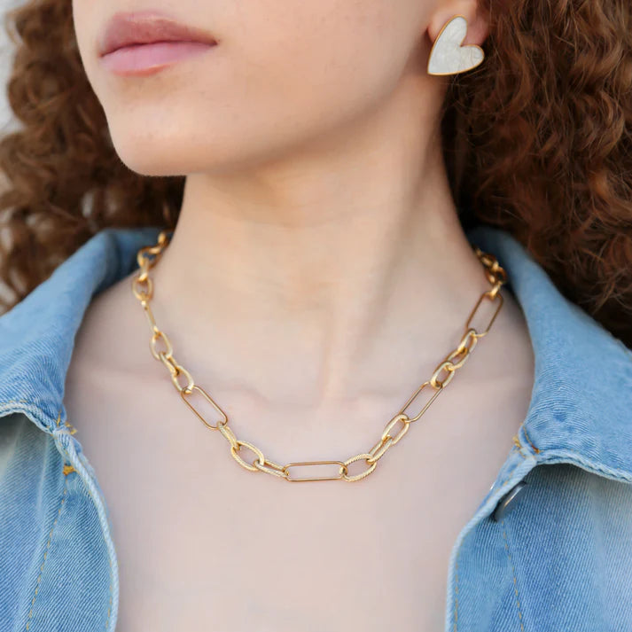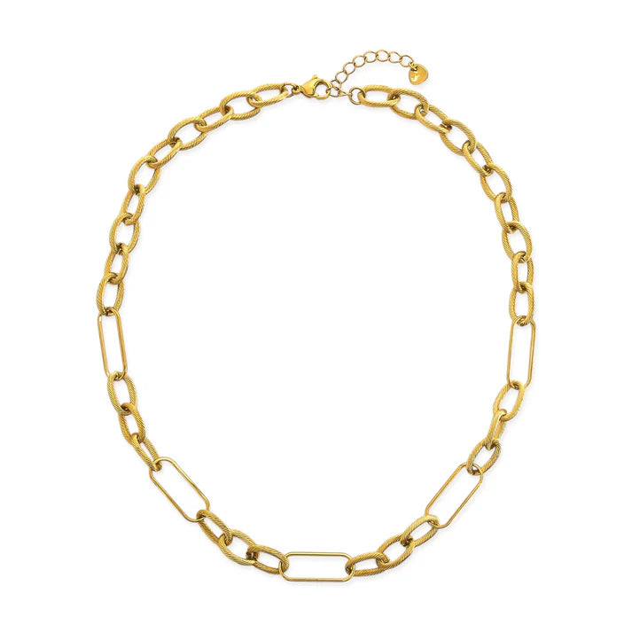 This architectural Water-Resistant chain necklace elegantly balances structure and fluidity, seamlessly merging bold geometric forms with surprising textures. Its design features a sophisticated combination of oval and rectangular links that interlace in a captivating rhythm, resulting in a visually dynamic piece. Each link contributes to a sense of depth and character.
