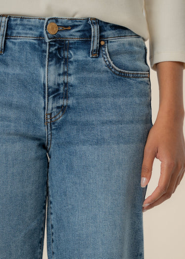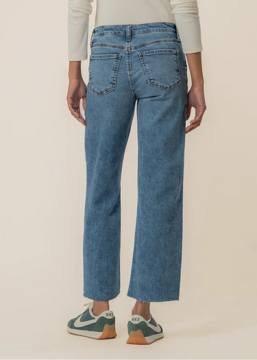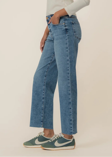 Step into effortless style with these high-rise wide leg jeans in a medium wash, designed for comfort and modern appeal. The high-rise waist flatters your silhouette, while the relaxed wide leg cut provides a timeless, easygoing look. Finished with a raw hem for a subtle, fashion-forward edge, these jeans are crafted from very stretchy fabric that ensures all-day comfort and flexibility. Perfect for casual outings or dressed-up every day wear, they’re a versatile wardrobe essential.