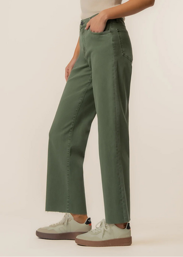 Effortlessly chic, these high rise, wide leg pants combine style and comfort. Crafted from very stretchy fabric, they offer a flattering fit that moves with you. The raw hem adds a modern, casual edge, while the unique seaweed color makes them a standout piece in any wardrobe. Perfect for dressing up or keeping it relaxed, these high rise, wide leg pants are versatile, stylish, and designed for everyday wear.