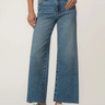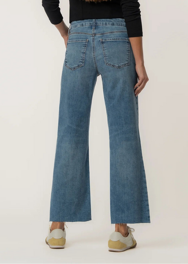 These high-rise wide leg jeans in a classic medium wash feature Fab Ab pockets for a smooth, flattering fit and stretchy fabric for all-day comfort. A raw hem and a hint of distressing give them a lived-in feel with a modern edge. Effortless and versatile, they’re your new go-to for casual cool.