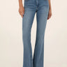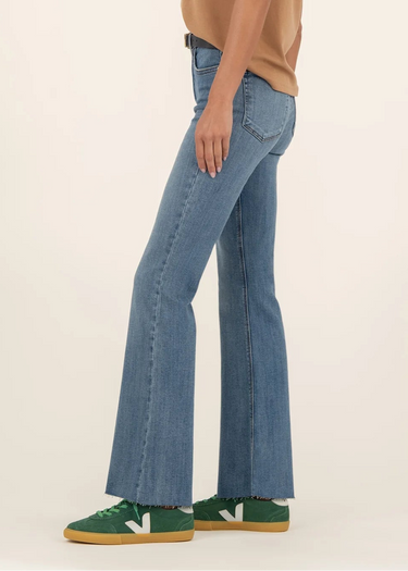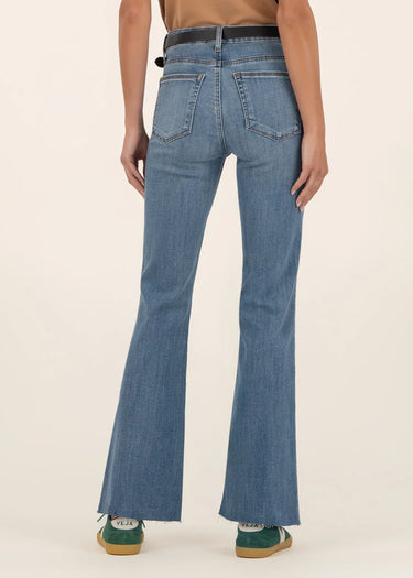 Turn heads in these high-rise flare jeans, rocking a vintage-inspired medium wash with Fab Ab for that flawless fit. The raw hem adds a rebellious touch, while super stretchy fabric keeps you moving with ease