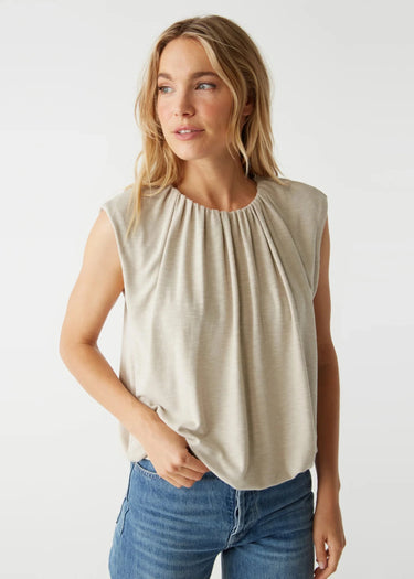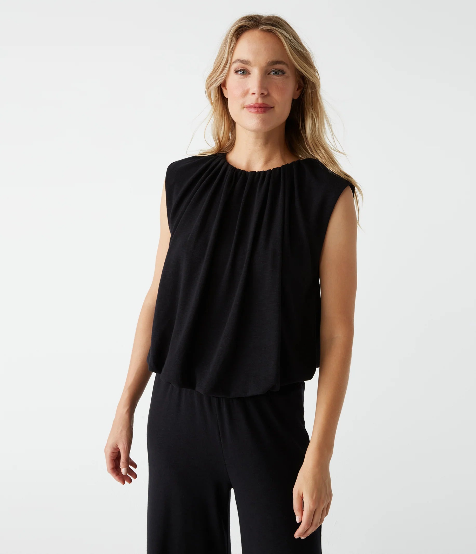 A quintessential day-to-night top. The elegant, gathered detailing and beautiful bubble hem are achieved by double-layering the soft jersey fabric. The top features a jewel neckline and the sleeves have a soft architectural look.