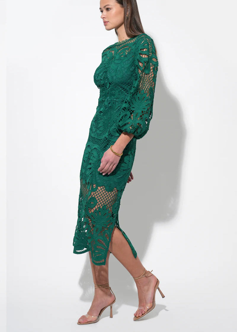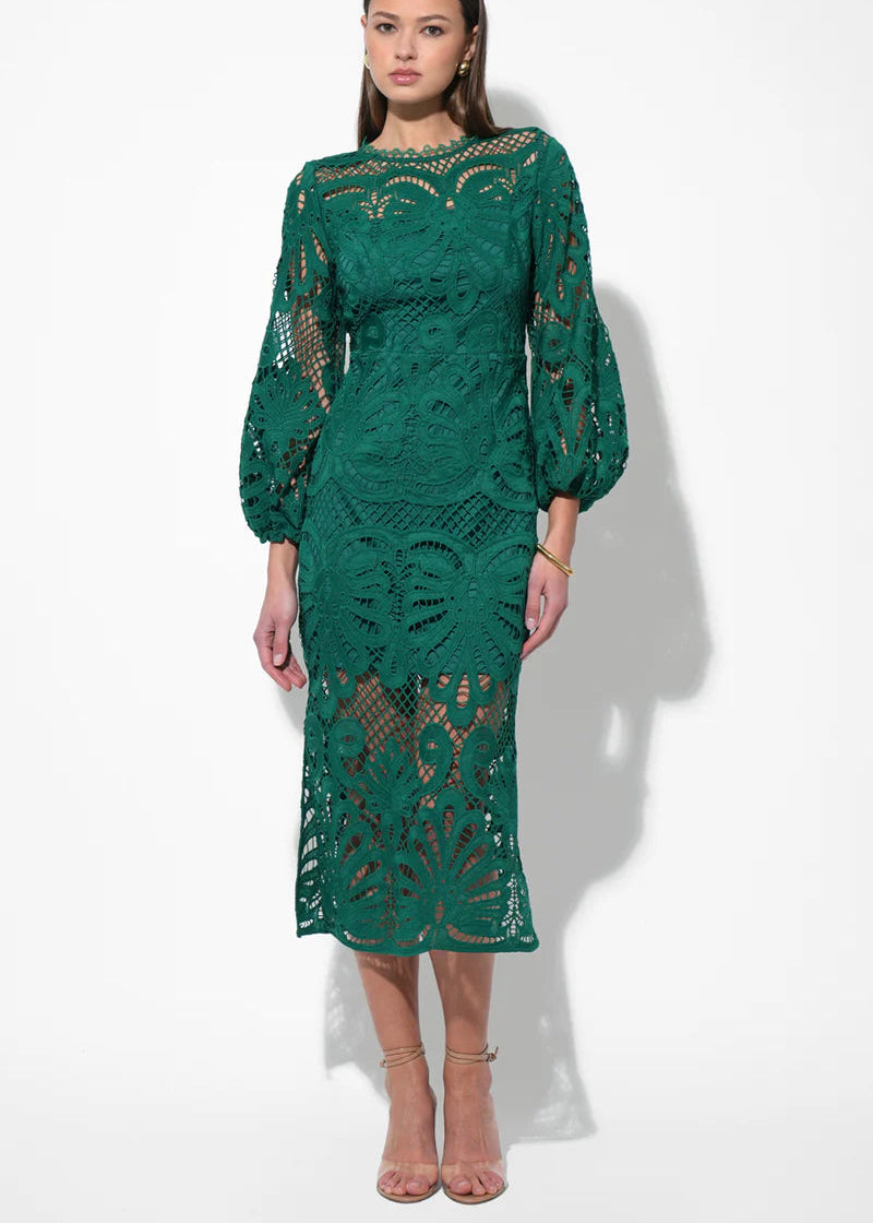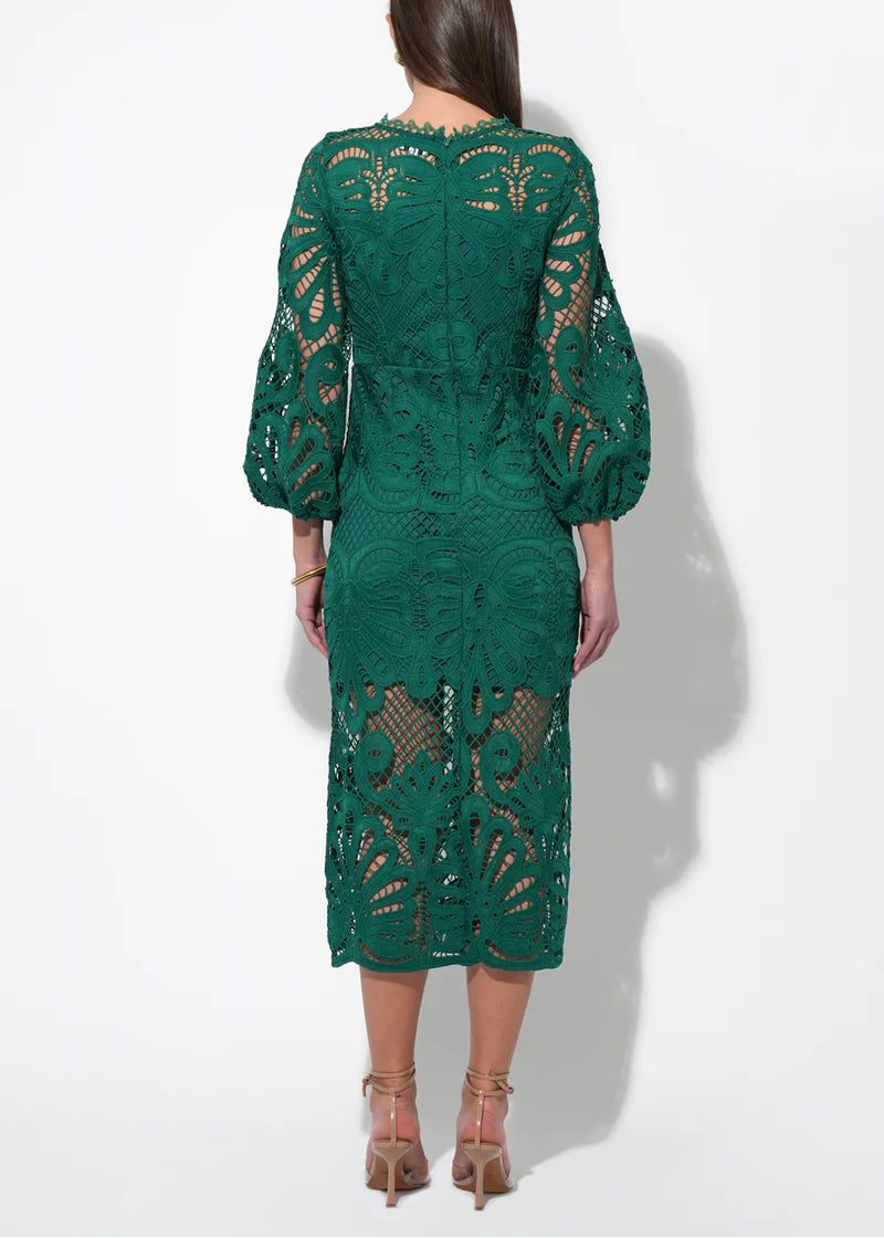 This captivating midi dress comes in a vibrant, eye-catching pink hue that radiates charm and confidence. It features a flattering V-neckline and exquisite puff sleeves crafted from delicate lace, adding a touch of romantic elegance.