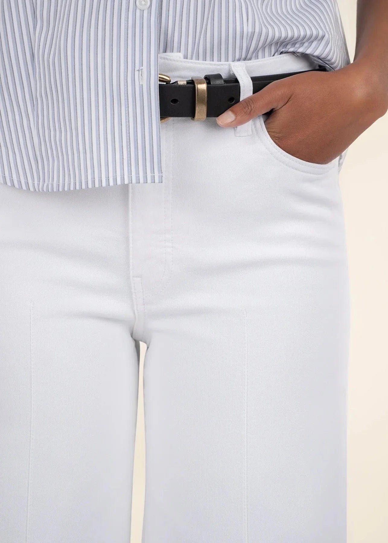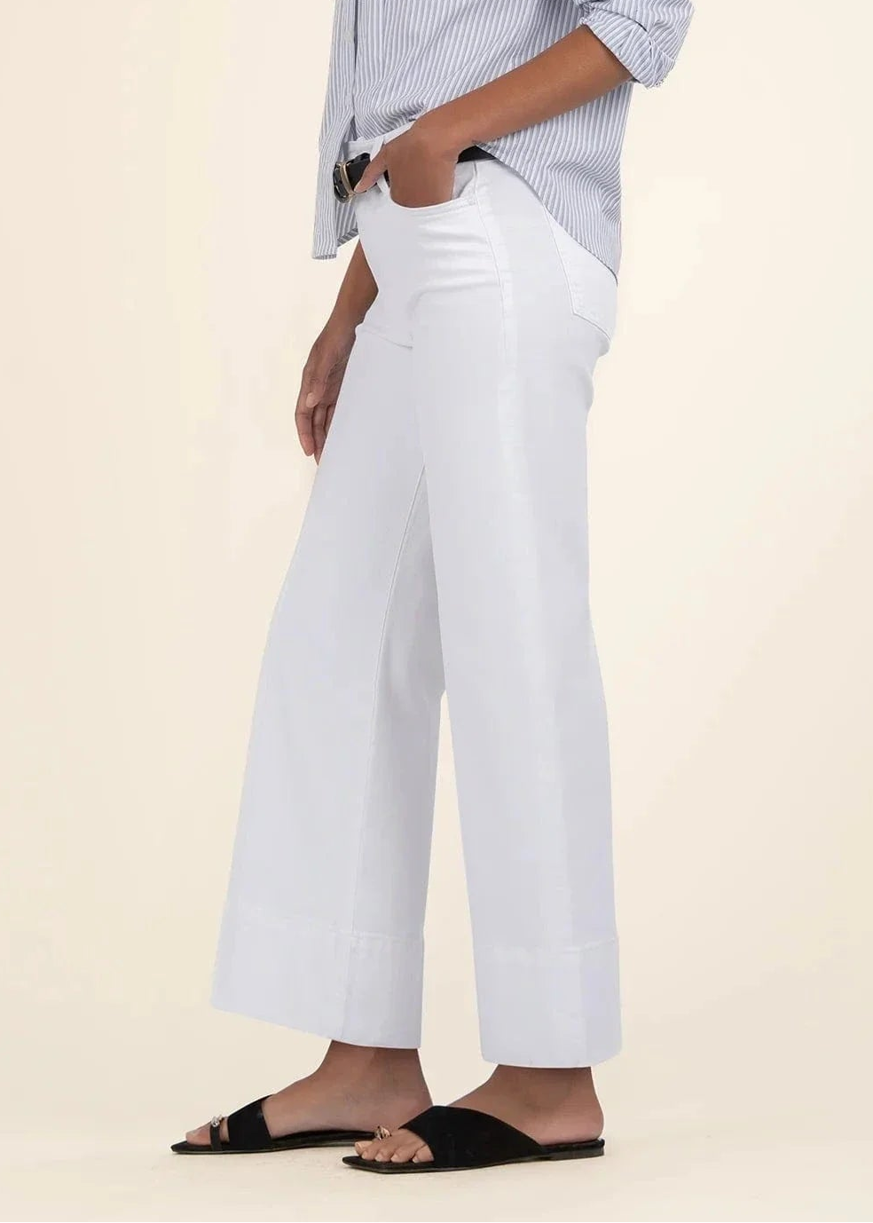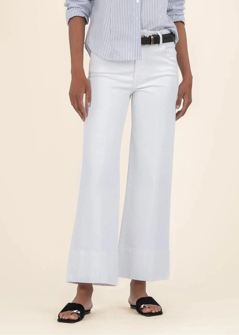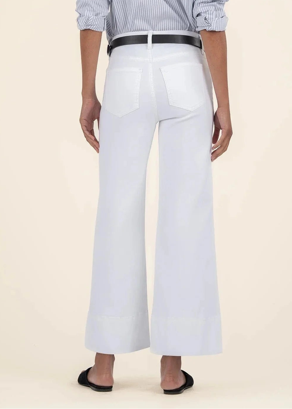 These pants are cut in a pintuck-detailed, wide-leg silhouette from stretchy denim, offering both comfort and style. The wide hem adds a bold, fashion-forward touch.