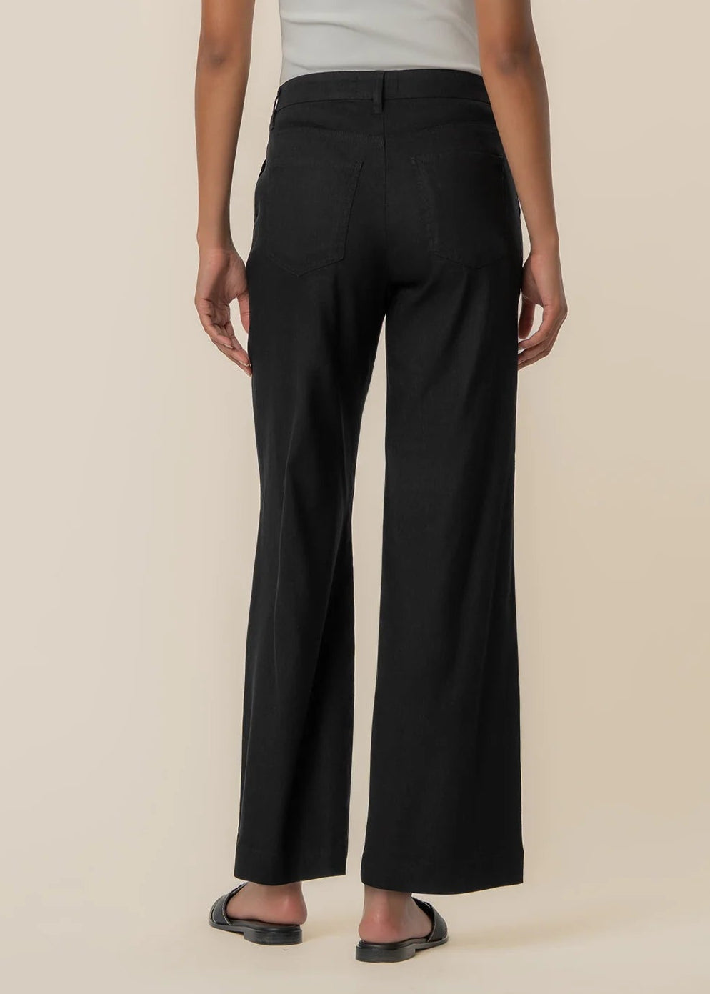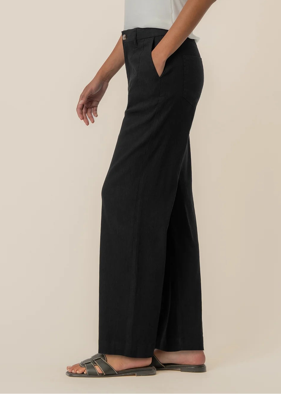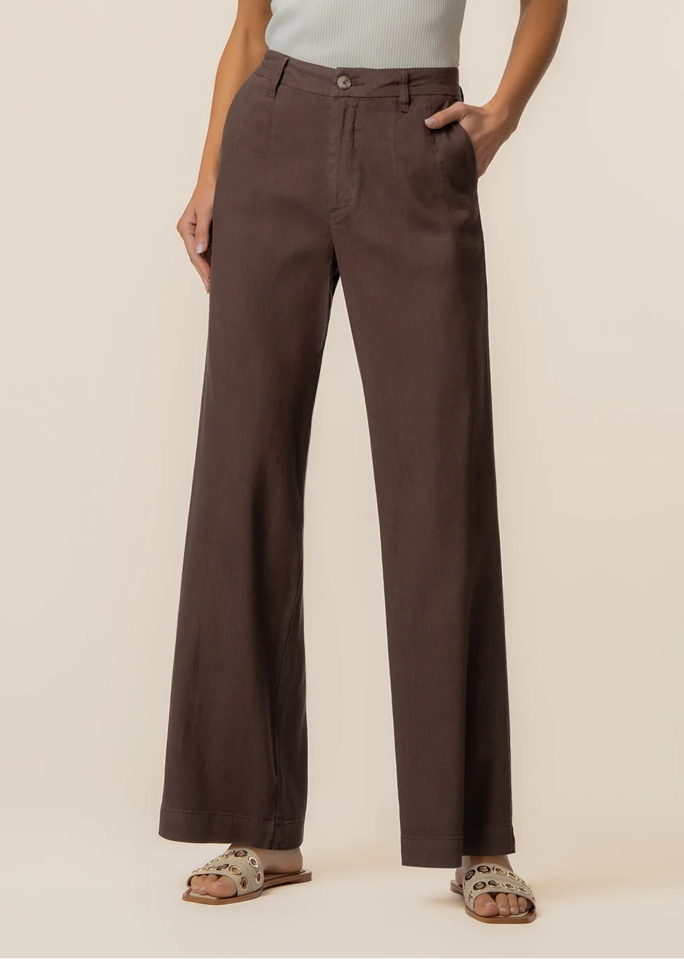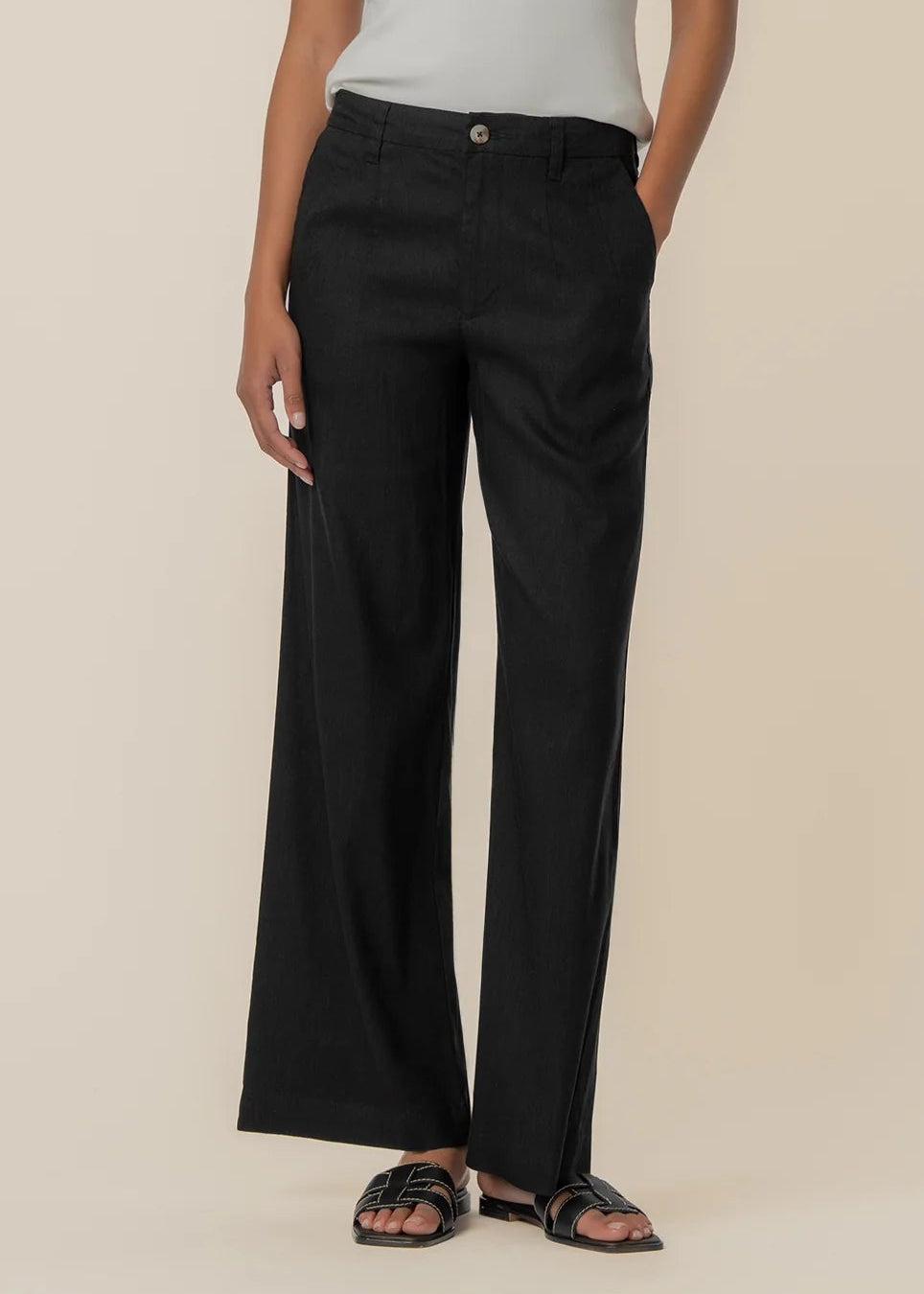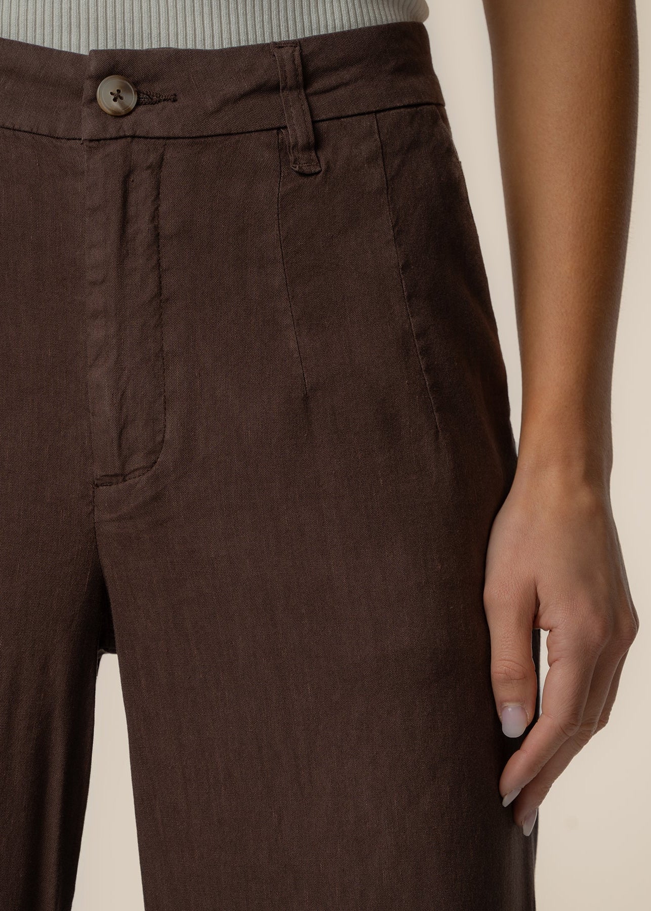 These high-rise pants feature a wide straight leg for a clean, elevated silhouette. A front pleat adds tailored detail and subtle structure, while the linen-mixed material keeps the look lightweight and breathable. Designed for effortless styling, these pants offer a relaxed yet refined feel that works for both casual and polished outfits.