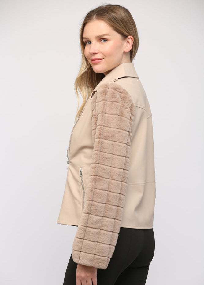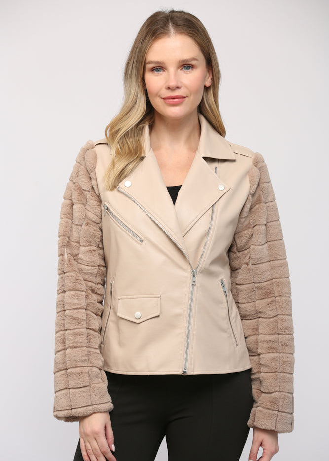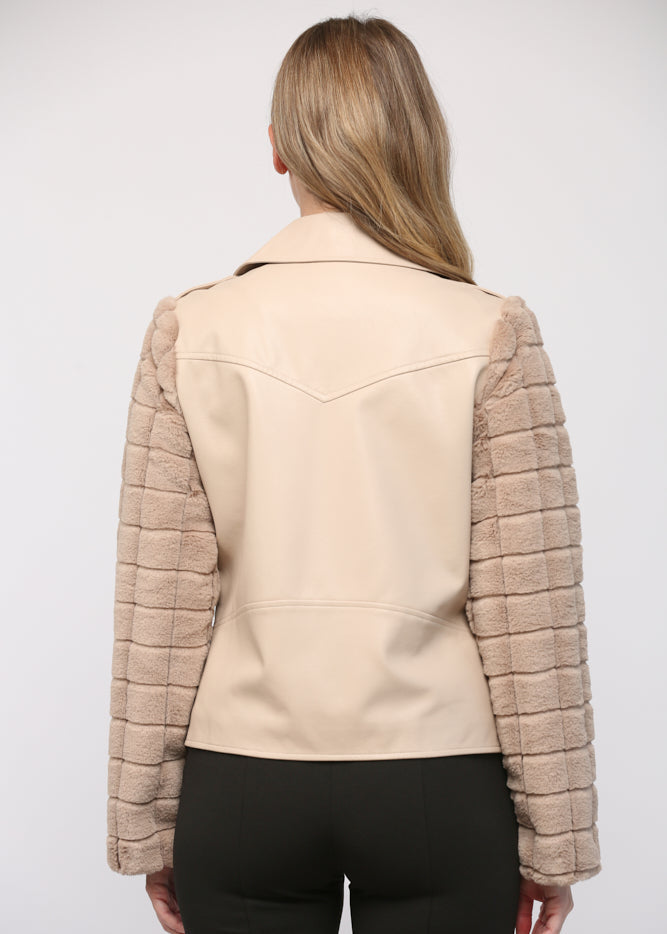 FAUX LEATHER MOTO JACKET WITH CONTRAST SLEEVE