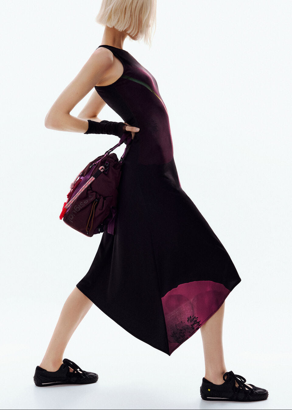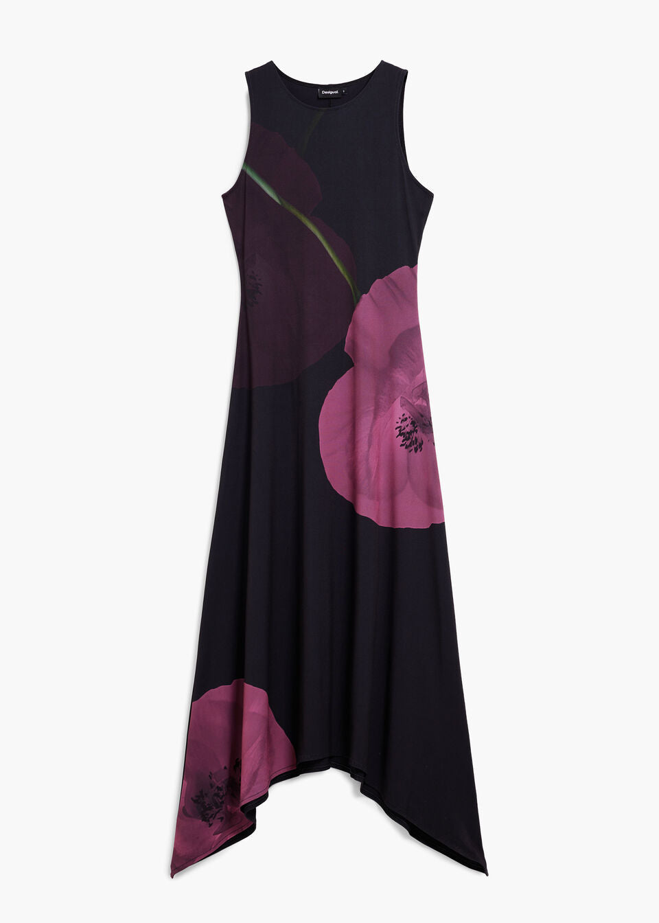 Sleeveless fluid dress with asymmetrical cut and large flower print on the side and hem.