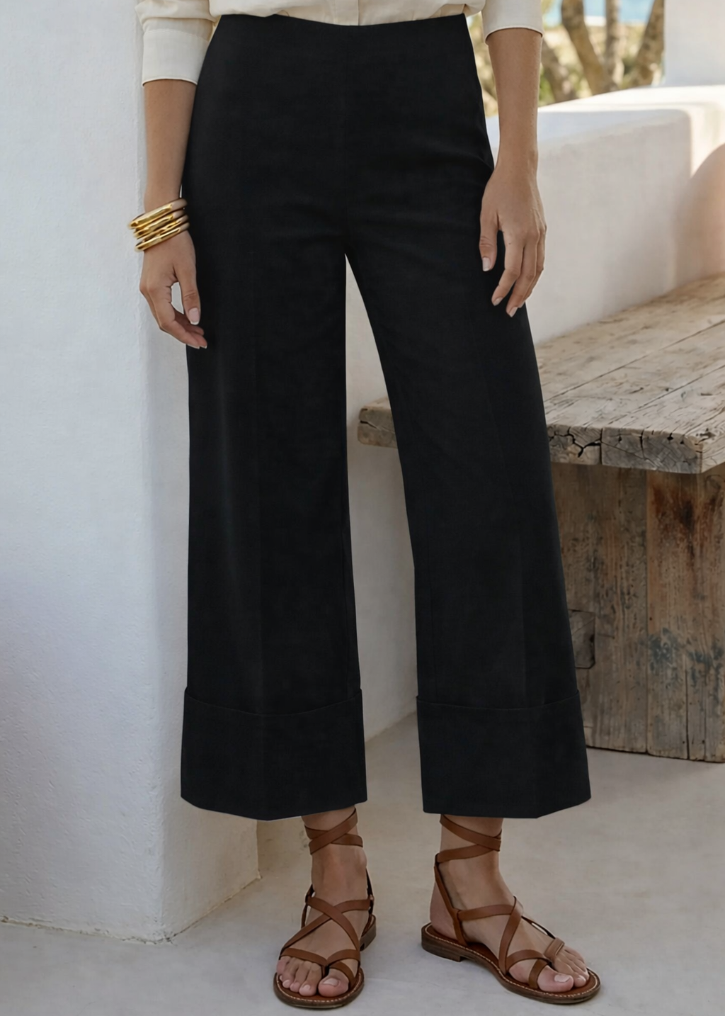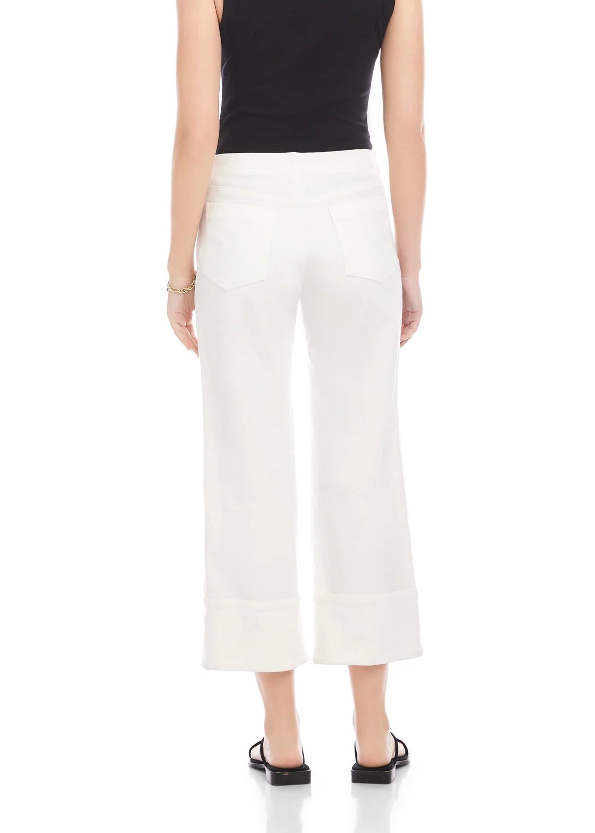 These cropped pants feature a comfortable pull-on design with an elastic waistband for an easy, flattering fit. The wide leg is finished with a structured cuff for a polished look, while two back pockets add simple, functional detail. A versatile style that pairs effortlessly with both casual and dressier tops.