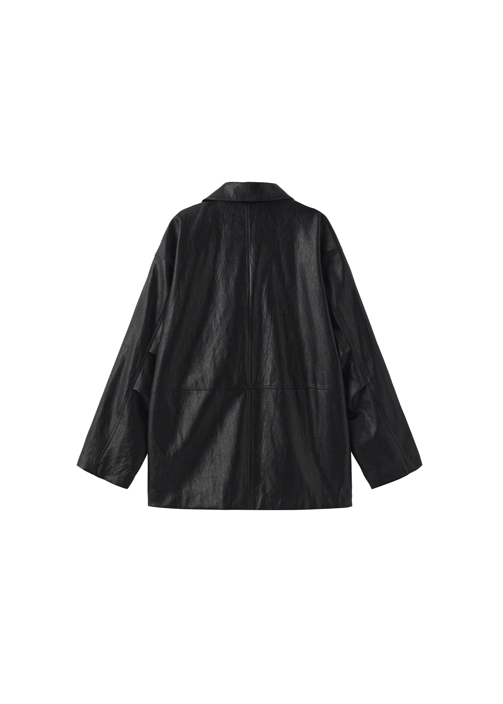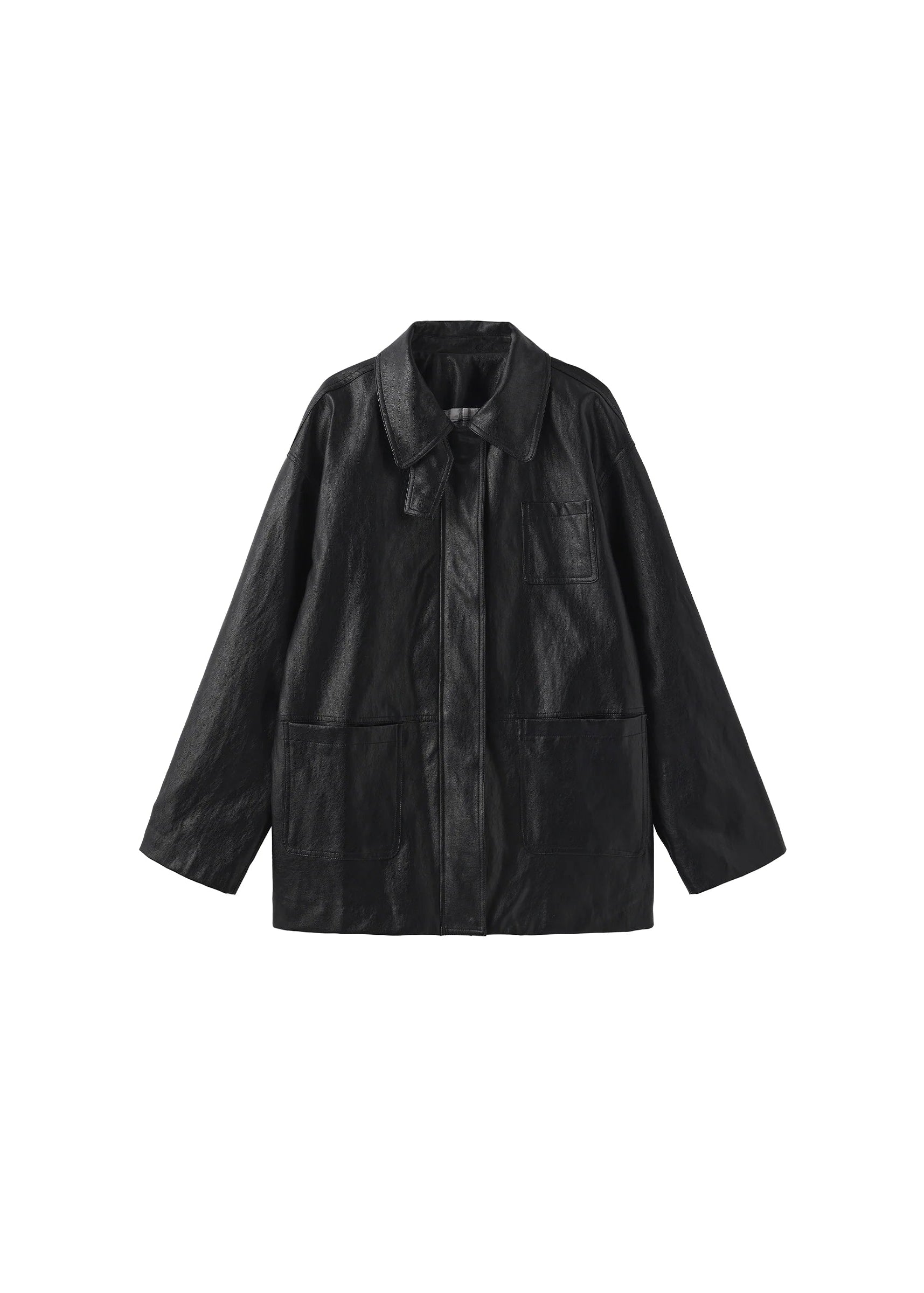 Stand collar oversized leather jacket in black. Features a relaxed fit, drop shoulders, and a stand collar. Front press-stud and zip fastening for a structured yet effortless look.