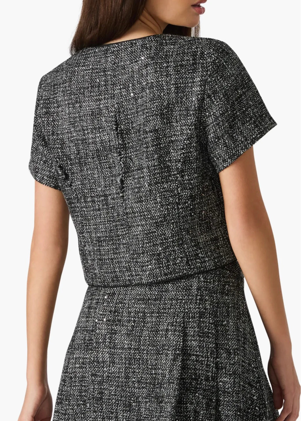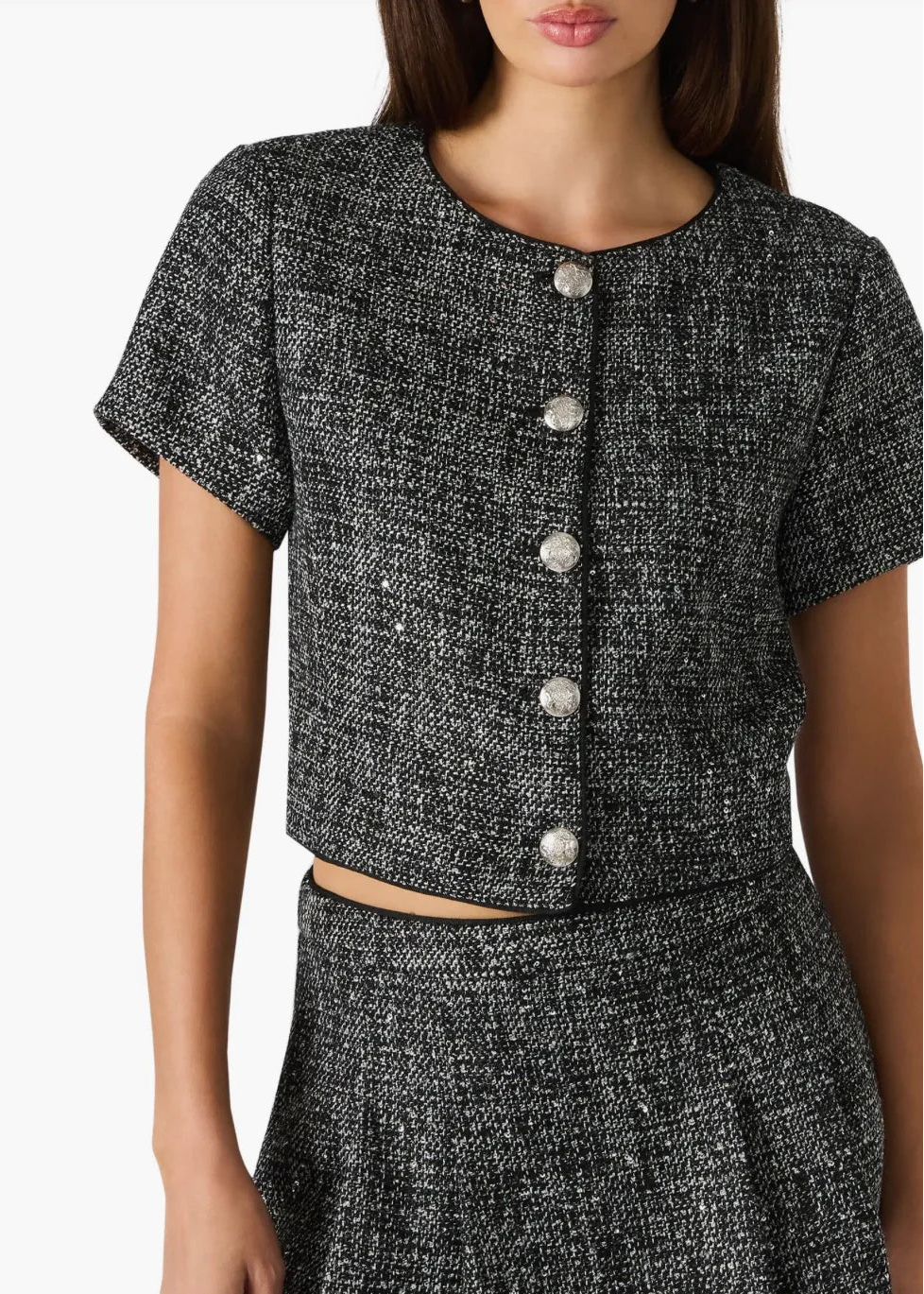 Shimmering sequin tweed brings rich texture to this Steve Madden top, cut in a compact silhouette with short sleeves and a clean crewneck. A front button closure, finished with polished crest buttons, completes the look with refined detail.