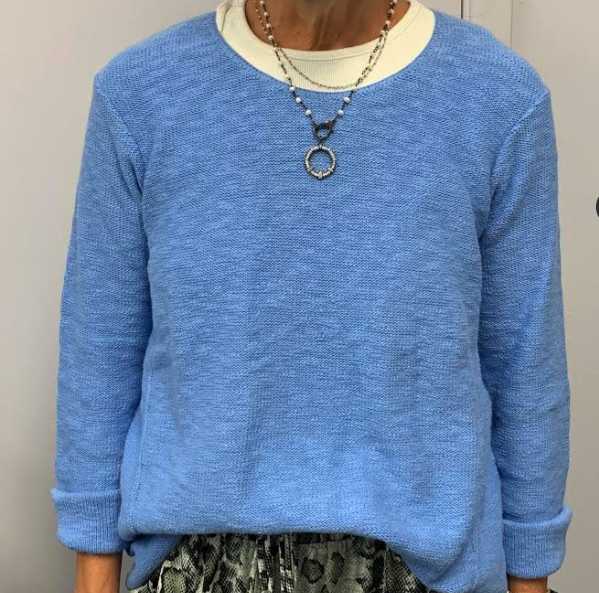 100% cotton and easy fit. This is everyone's go to sweater, incredibly comfortable and stylish.