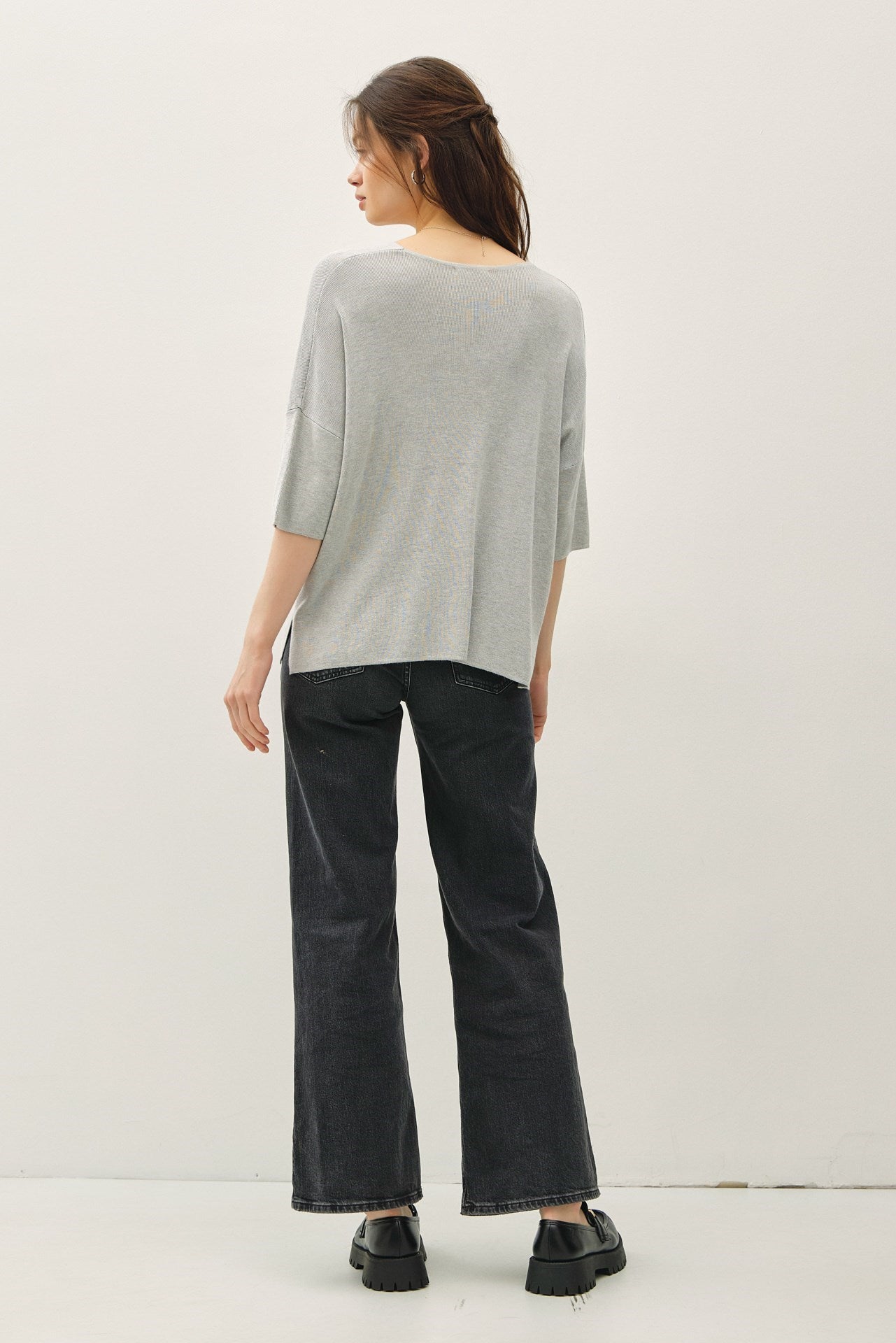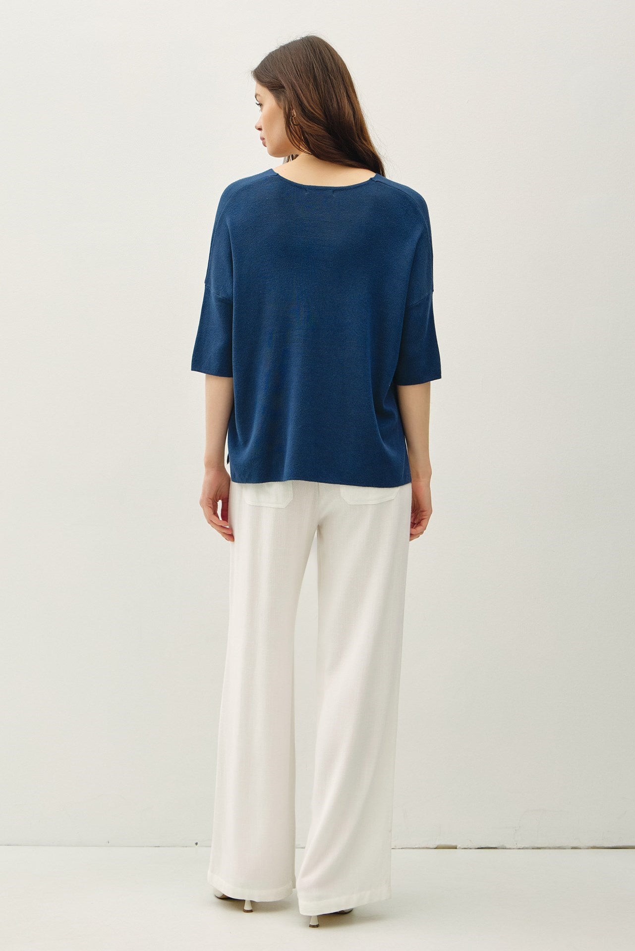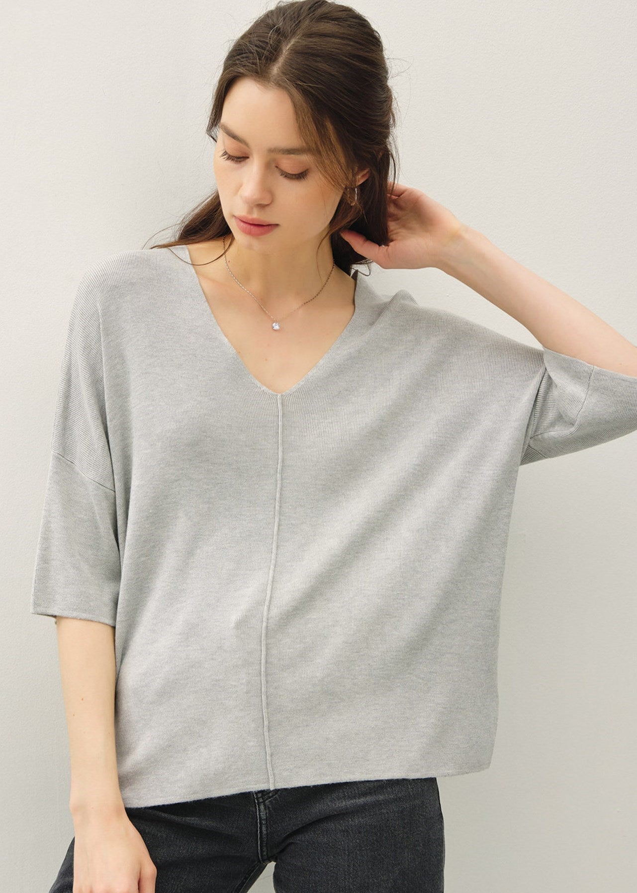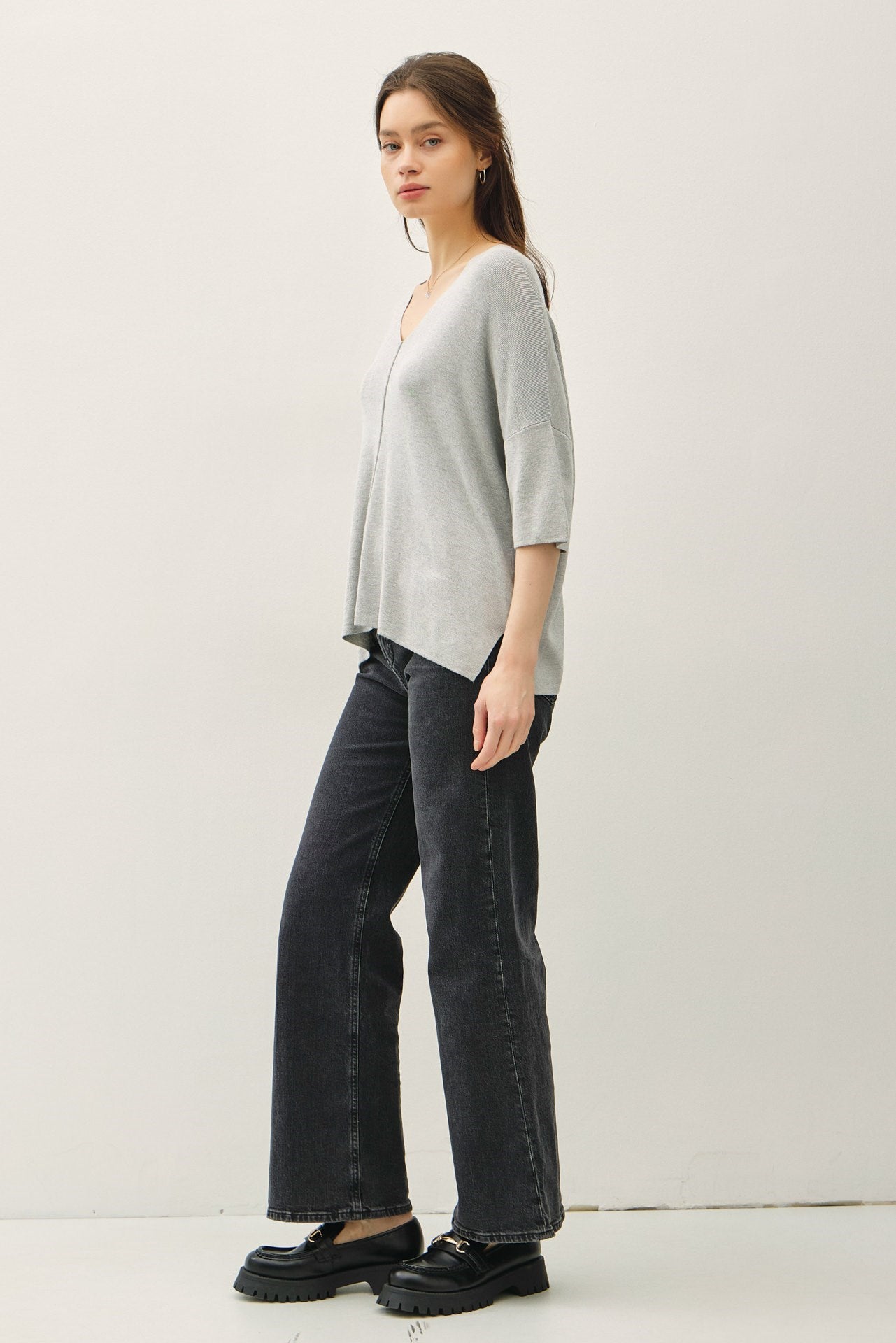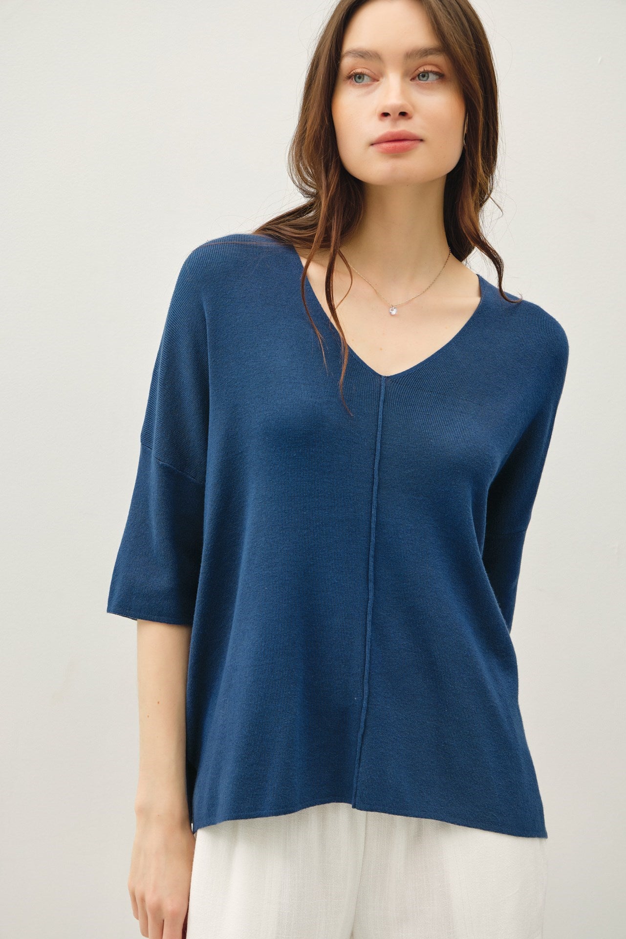 V-NECK DROPPED SHOULDER HALF SLEEVE SWEATER