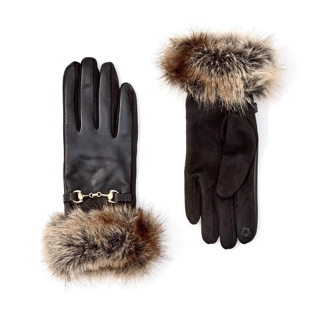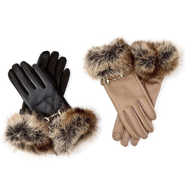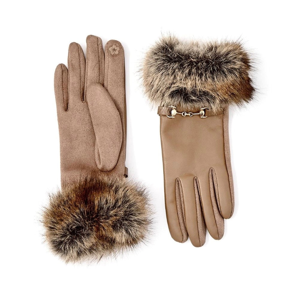 The marbled faux fur cuff adds a touch of sophistication, complemented by gold metal hardware for a chic finish. Crafted with a stretch fabric palm and touch screen fingertips, these gloves offer both style and functionality in two versatile colors: classic black and soft taupe.