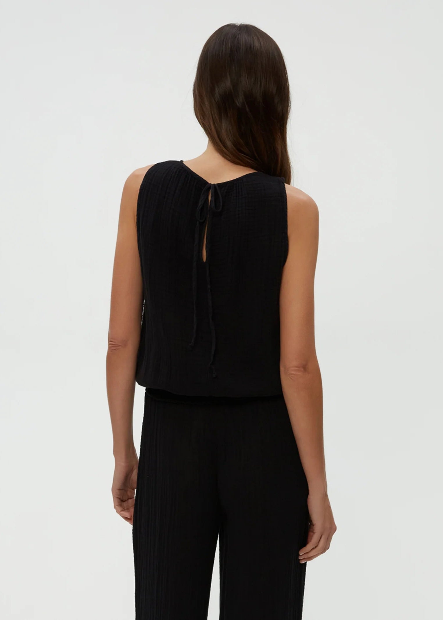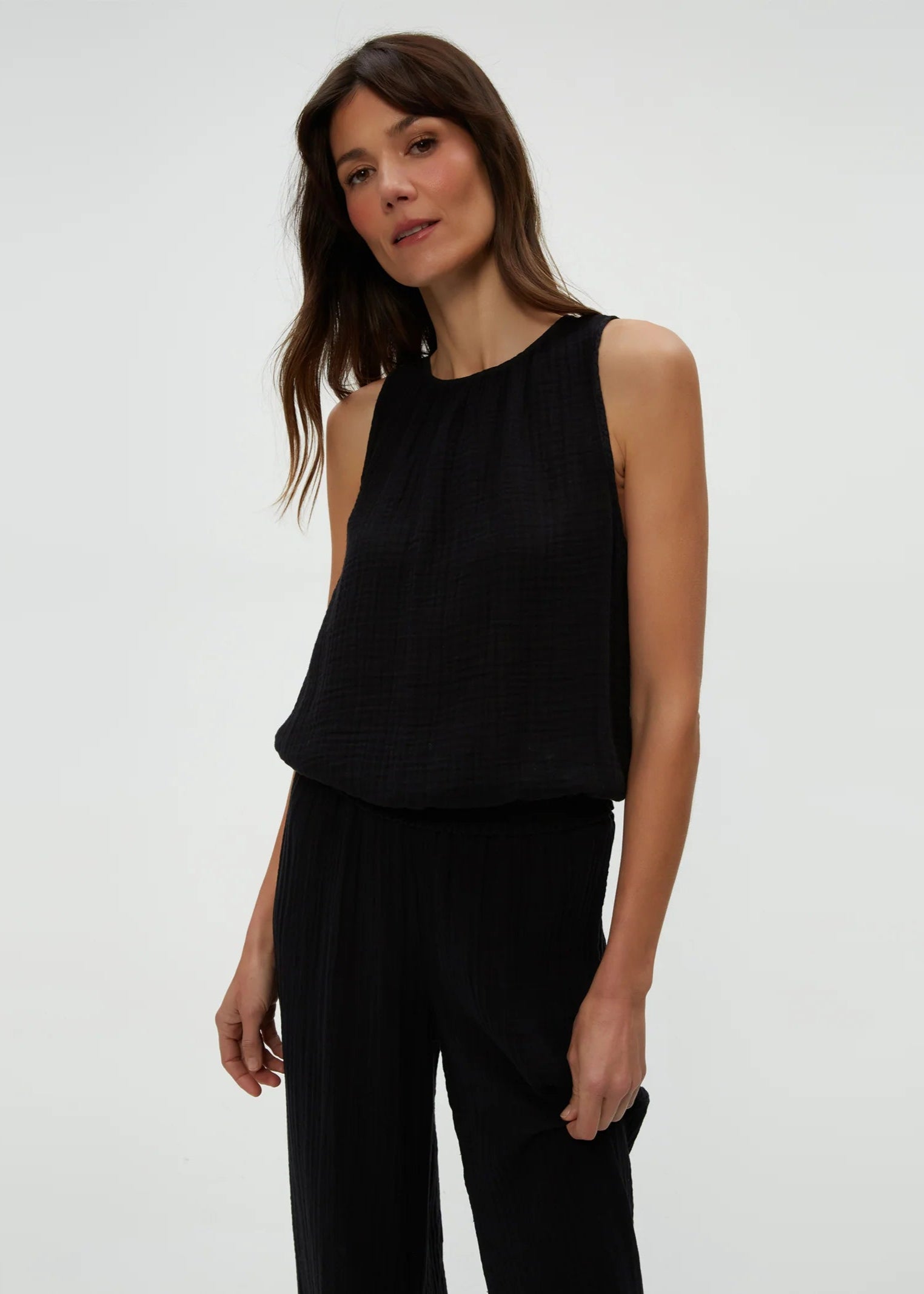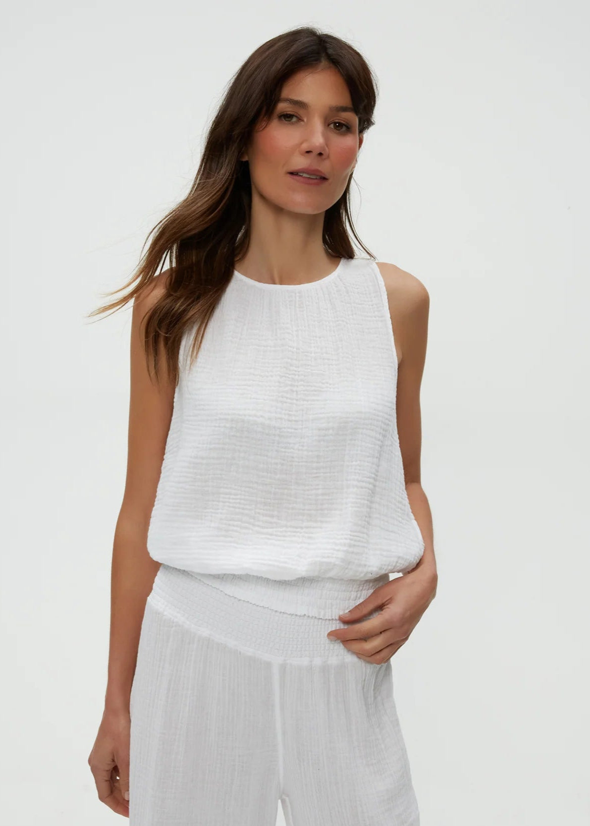 Meet Janelle: a tie-neck tank with a smocked bottom and shirring at the neck. Crafted with 100% Cotton Gauze that’s light, airy, and perfect for warm weather styling.