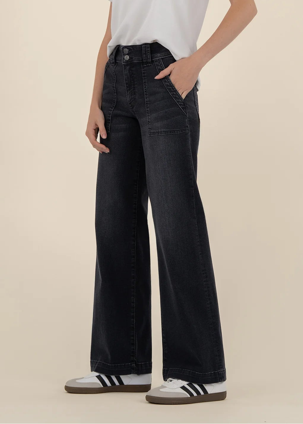 Discover the perfect blend of style and comfort with these high-rise straight leg jeans in a sleek black wash. Featuring unique porkchop pockets, double belt loops, and stylish double front buttons, they’re crafted from very stretchy fabric for a flattering fit that moves with you all day long.