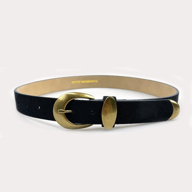 A stylish belt crafted from real suede, featuring a distinctive curved buckle and oval details for a bold and contemporary look. Perfect for elevating your wardrobe with a touch of sophistication.