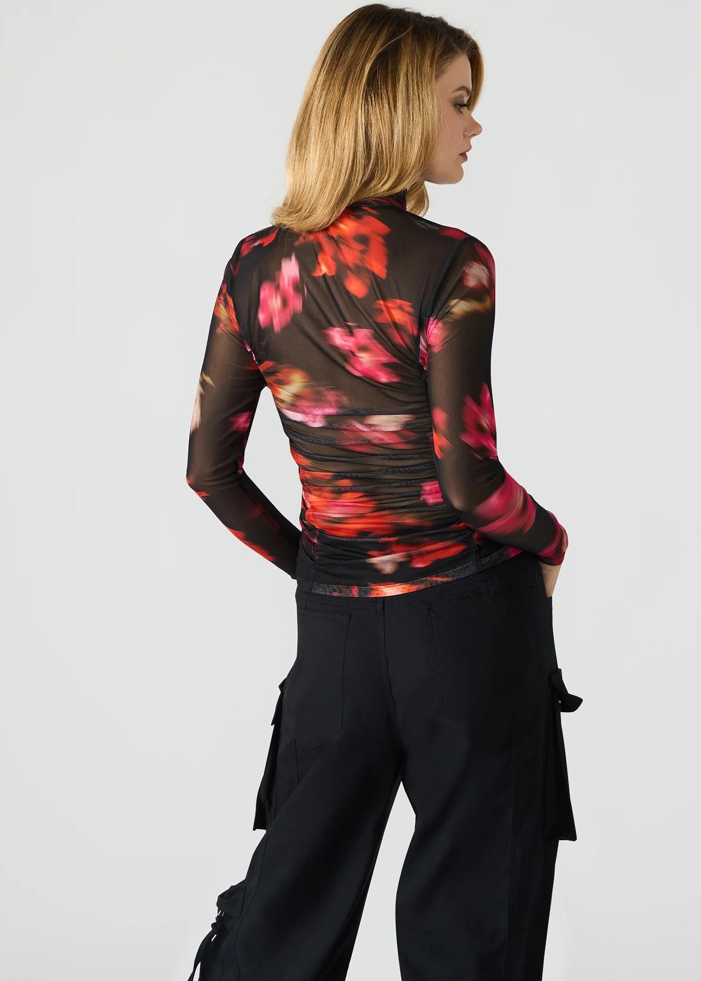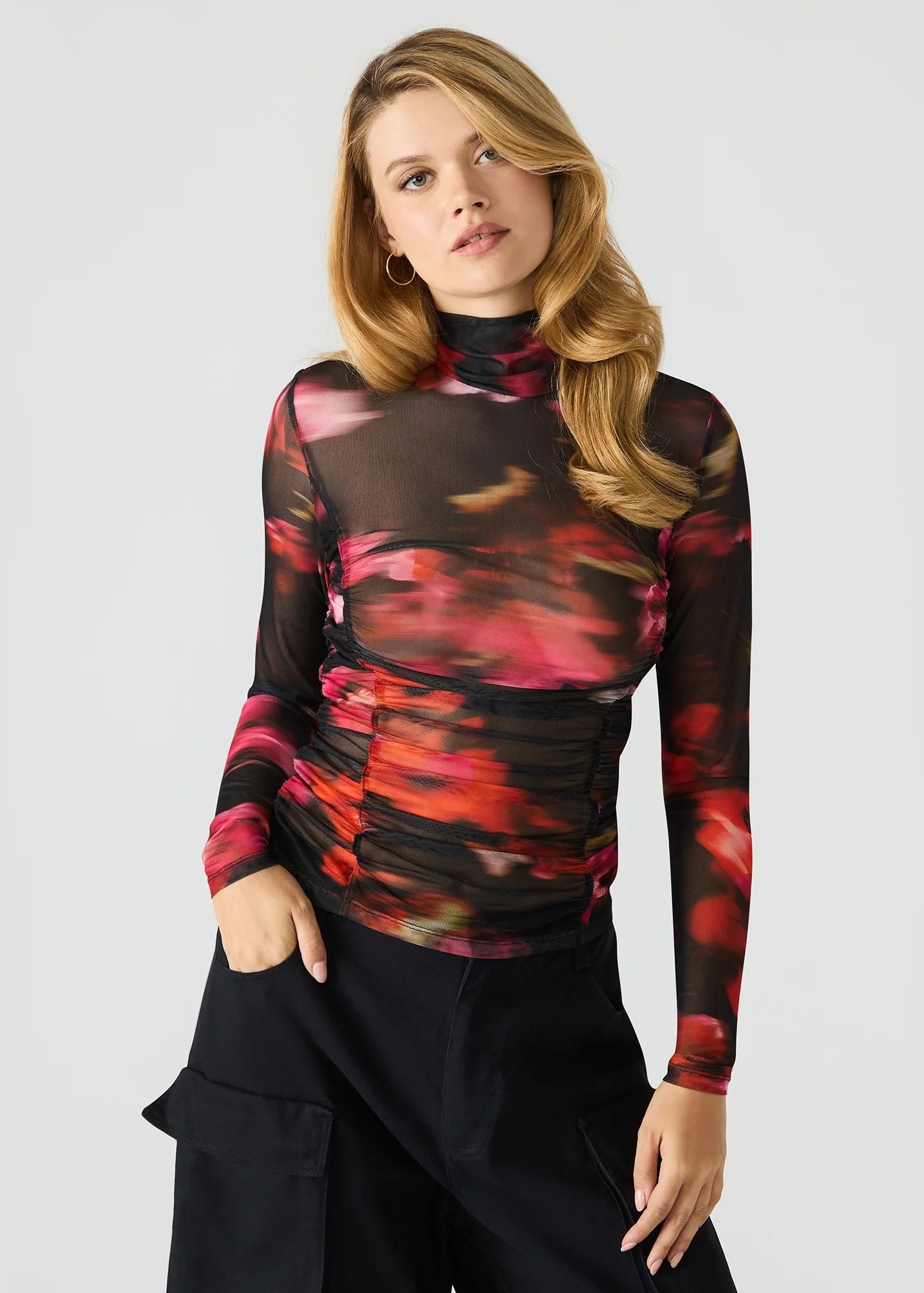 The TAYLORE TOP BLURRY FLORAL features a long-sleeved, mock neck design crafted from breathable mesh fabric. Its artistic floral print adds a modern edge, making it ideal for layering or wearing alone. This top combines style and comfort while offering a lightweight, form-fitting silhouette that enhances your wardrobe with subtle sophistication.