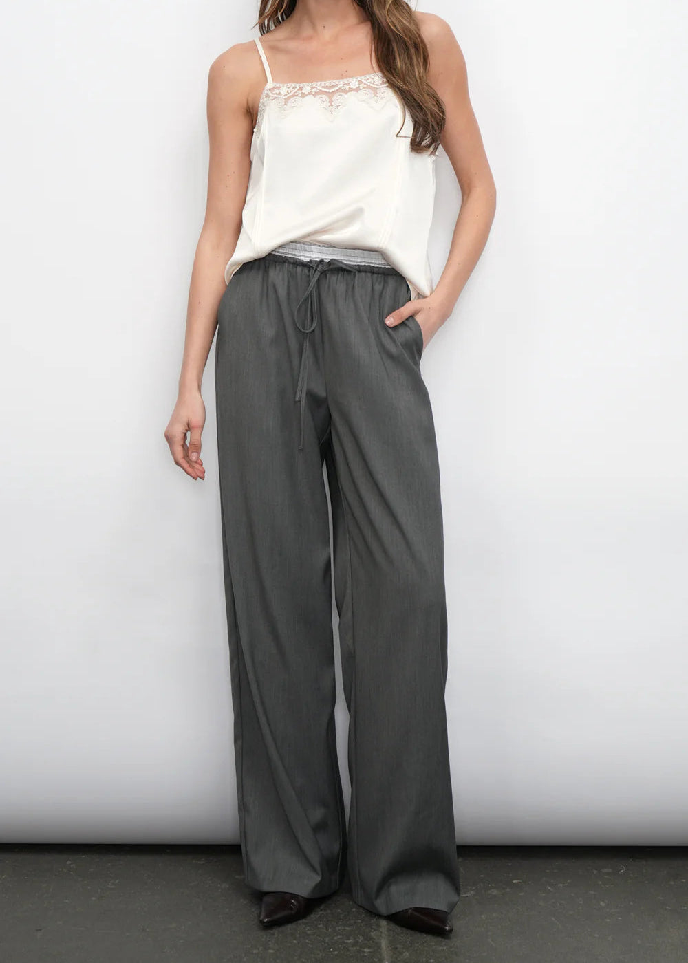 These chic wide-leg trousers, in a versatile neutral hue, offer an effortlessly sophisticated silhouette. They feature a comfortable drawstring waist for a relaxed fit, combined with a unique "double" detail (likely a subtle pleat or refined seam) that adds a touch of modern sartorial flair.