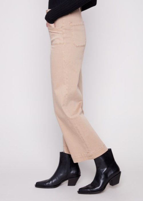 Cropped Wide Leg Colored Twill Pants with Rectangular Patch Pockets